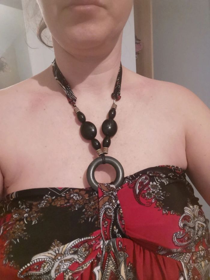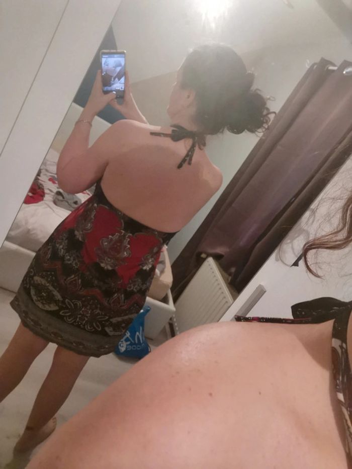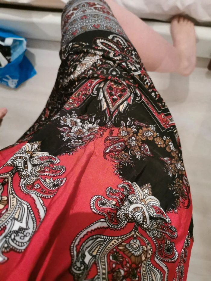 Robe d'été noir et rouge. Matière elasthanne je pense un peu comme les maillots de bain. Coussinets en mousse