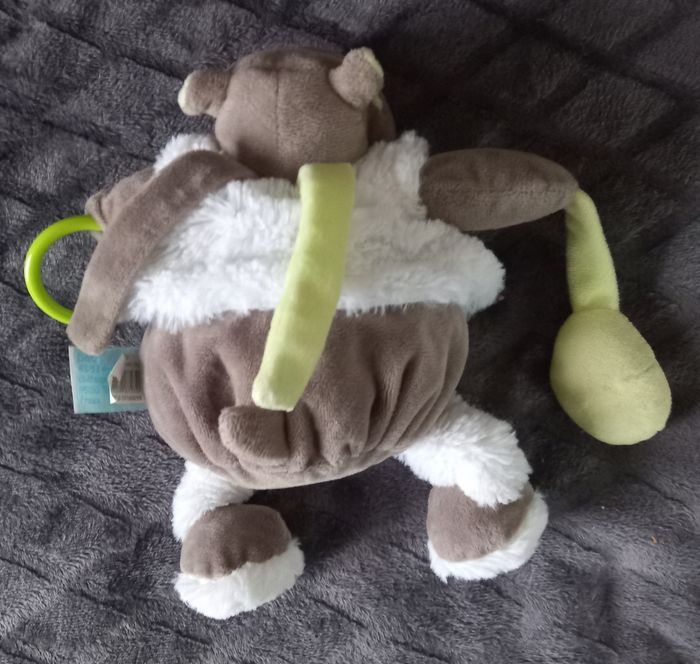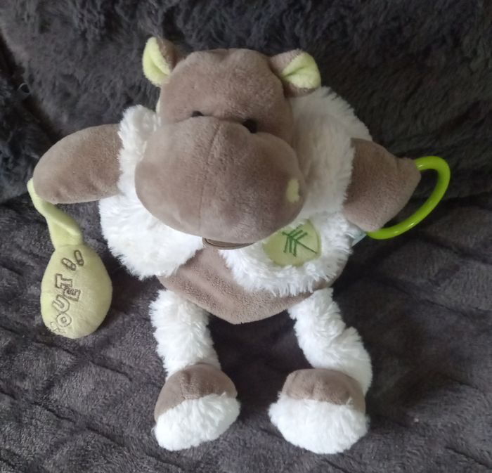 Doudou peluche pantin hippopotame en velours de couleur gris marron et en velours fourrure de couleur blanc Pattes étirable avec bruit de papiers froissés Bruit de hochet dans la tête Attacher à sa main bruit de pouet pouet et à l autre main anneau en plastique Feuille de couleur verte brodée sur le gilet