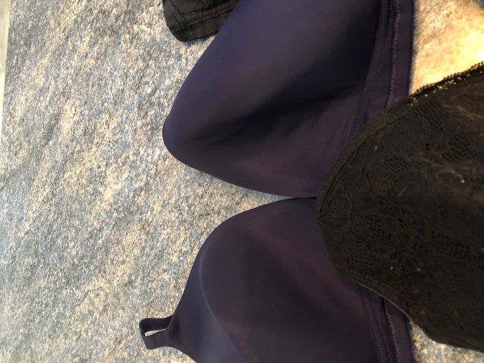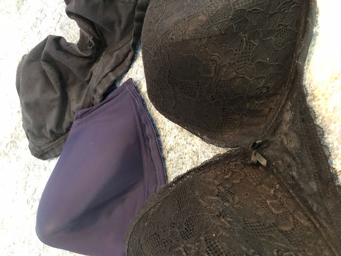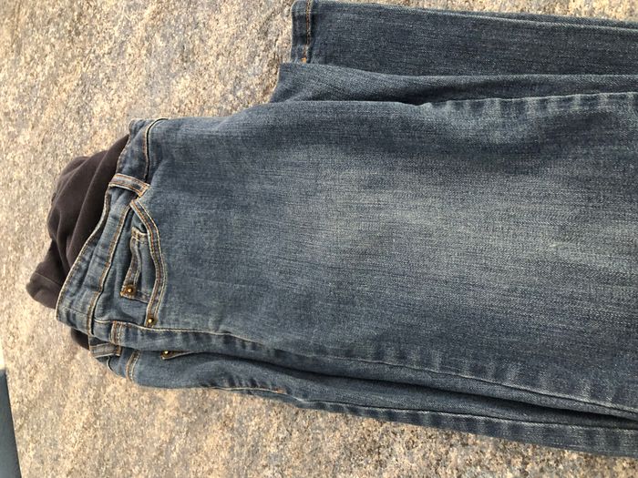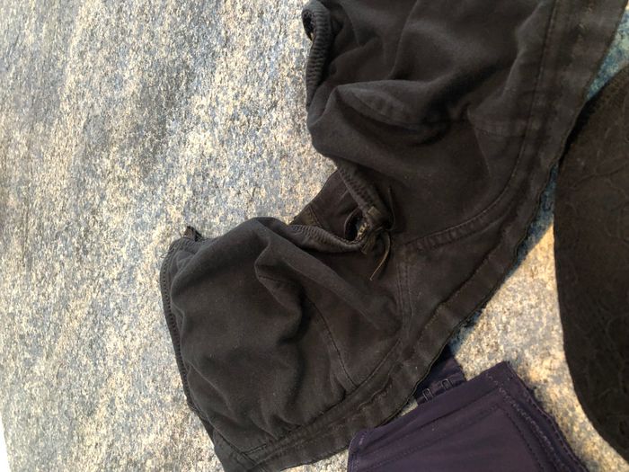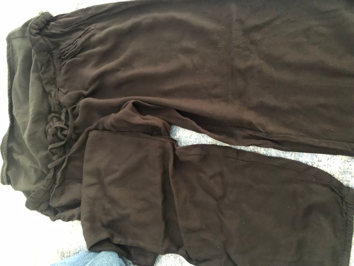 1 pantalon tissu noir Kiabi Taille 38 mais modèle large plutot un 40 j'ai remonté une jambe sur la photo pour voir finition du bas