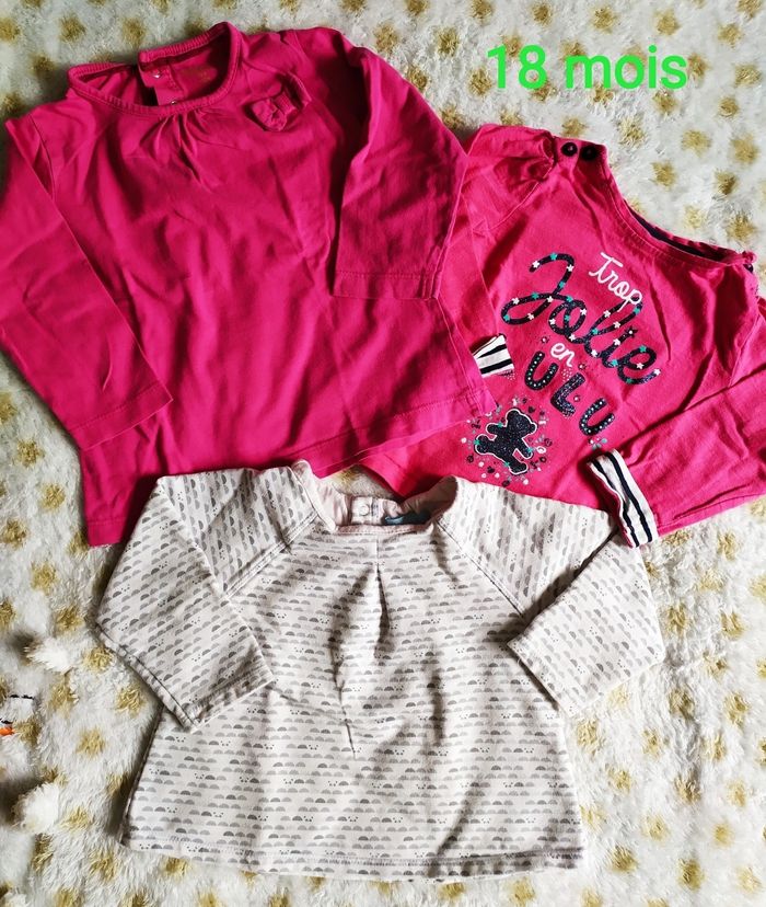 Lot de 3 jolies hauts manches longues en coton Taille 18 mois. Okaïdi, Lulu castagnettes et kimbaloo Très bon état, Prêts pour une nouvelle vie