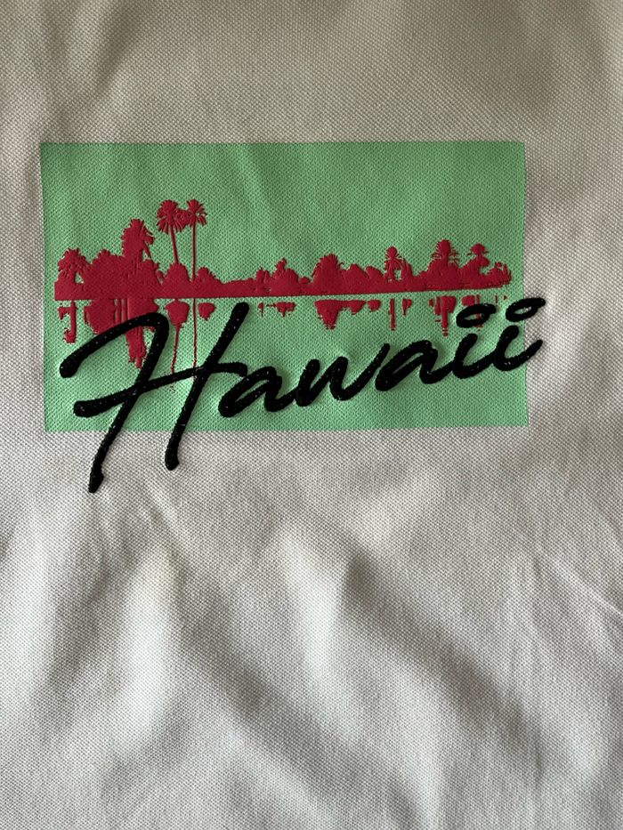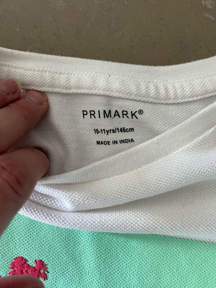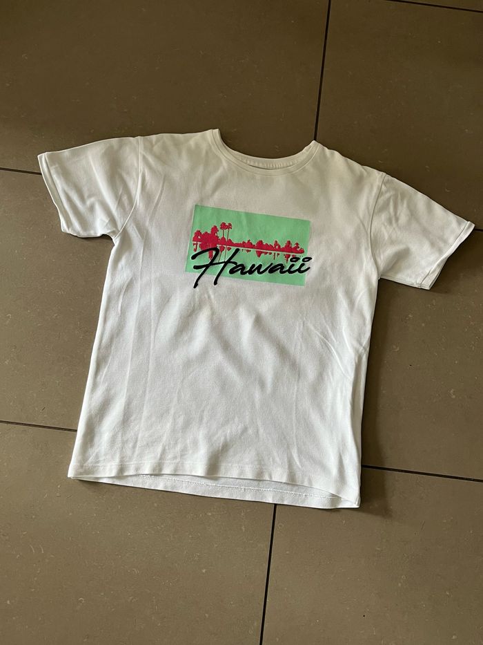 Vends joli t-shirt Blanc avec motif Hawaï Primark Matière comme du polo Taille 9/10 ans sur l’étiquette Peu porté