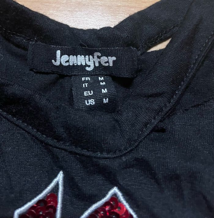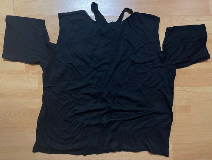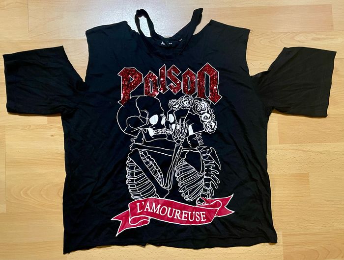 Tee shirt ouvert aux épaules de la marque Jennyfer Taille M Dimensions largeur aux épaules 38 cm, largeur à la poitrine 47 cm, longueur 48 cm Motif squelettes Légères traces d’utilisation Occasion, bon état