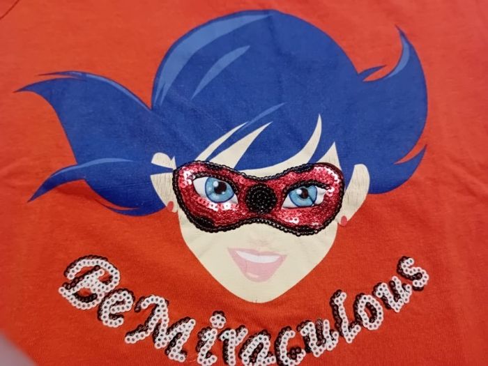 Tee-shirt Miraculous je pense taille 2-3ans, les étiquettes sont effacés. Couleur rouge orange, moins flash que sur la photo et le dessin est un peu effacé par endroit.
