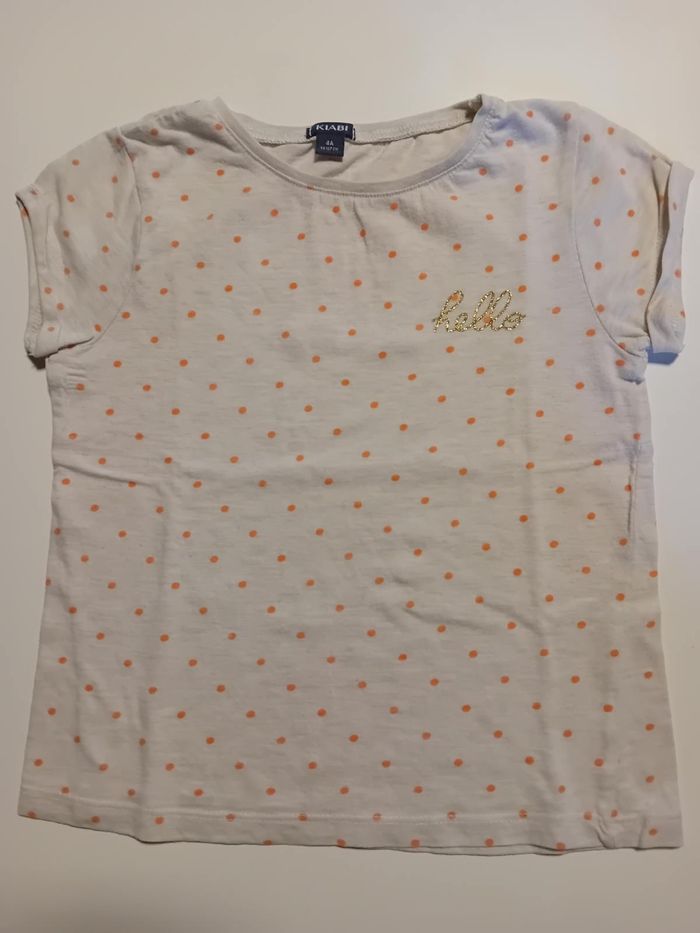 Tee-shirt couleur blanc cassé, beige avec des points orange flash. Taille 4ans 98-107cm.