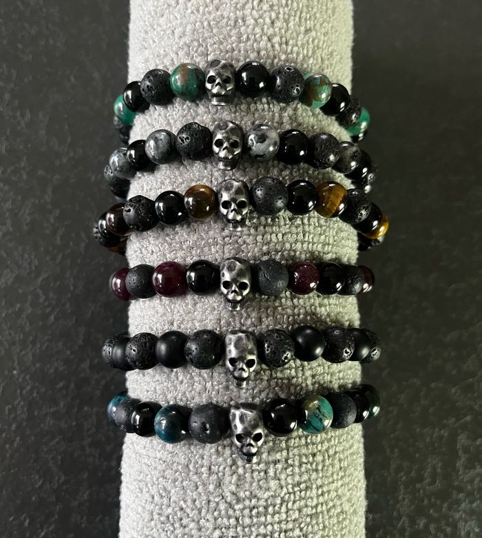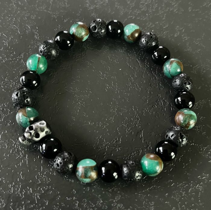 ✨ D E S C R I P T I O N ✨ 💎 Pierres utilisées : Pierre de lave, jaspe et agate noire. Pièces d'ornements en acier. 📏 Taille des perles : 8 mm 💎 Élastique 3 cordes ce qui le rend solide, facile à enfiler et à retirer. 📏 Largeur du bracelet : Au choix, à convenir en message privé. 🇫🇷 Fabriqué en France Taille moyenne pour une femme : 15 cm Taille moyenne pour un homme : 18 cm ✨ P A C K A G I N G ✨ Chaque bijou est confectionné avec le plus grand soin en Bretagne. Tous les articles sont livrés dans une jolie pochette noire type velours. Un cadeau idéal pour toutes occasions, Saint-Valentin, fête des mères/pères, Noël, anniversaire ou simplement pour vous faire plaisir à vous :)