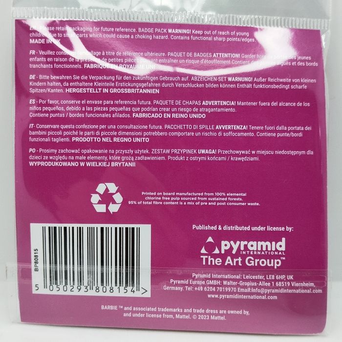 Pack de 5 badges officiels Barbie . Dimensions : 4 badges 25mm + 1 badge 38mm . Article neuf et emballé . Prix ferme et définitif