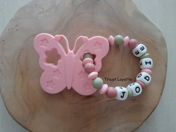 Anneau de dentition papillon Réalisé avec du ruban à la place du fil, pour plus de sécurité Prénom au choix Delais de fabrication: maximum 5 jours (hors dimanche et jour férié) Je ne réalise l'anneau qu'une fois le paiement validé, une photo vous sera envoyée avant l'envoi.