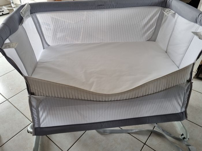 Je vends un cododo chicco next2me air, achetée en 2023 à 229e. 6 positions en hauteur. Une toute petit tâche de sang sur le côté, voir troisième photos. Bébé s'était écorché la main et une légère trace. Mais sinon Il est en parfait état, avec une alèse et trois housses. La housse est lavage en machine. Livrée avec un sac de rangement et dans son carton d'origine.