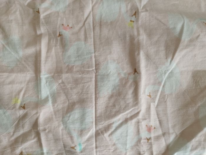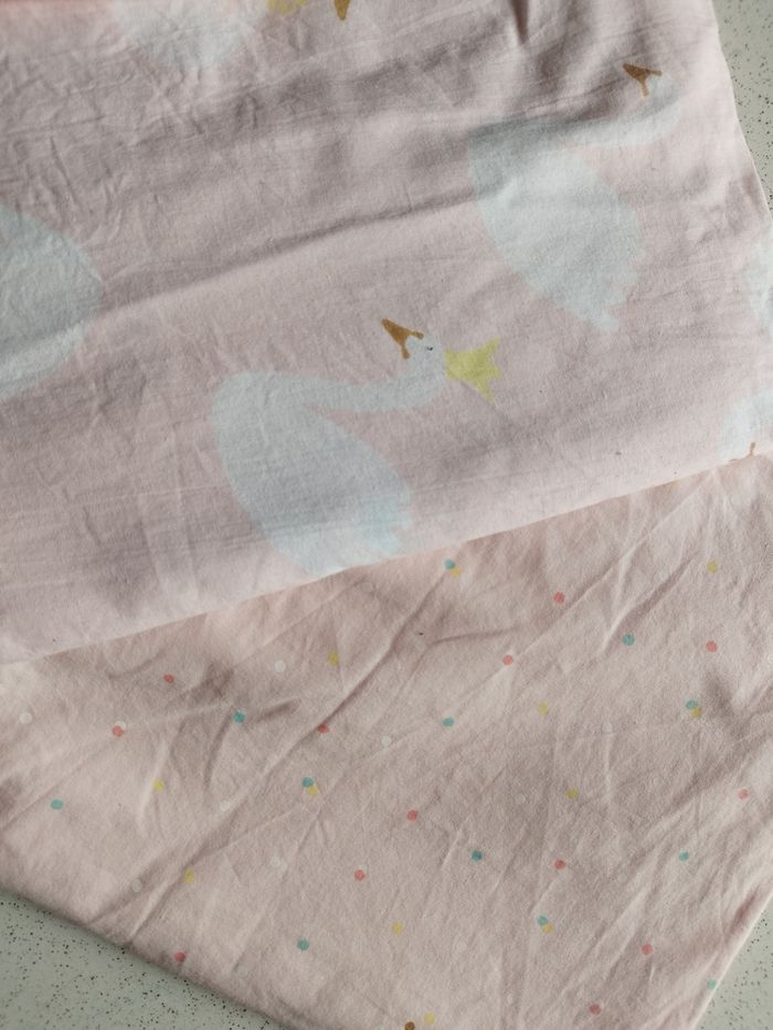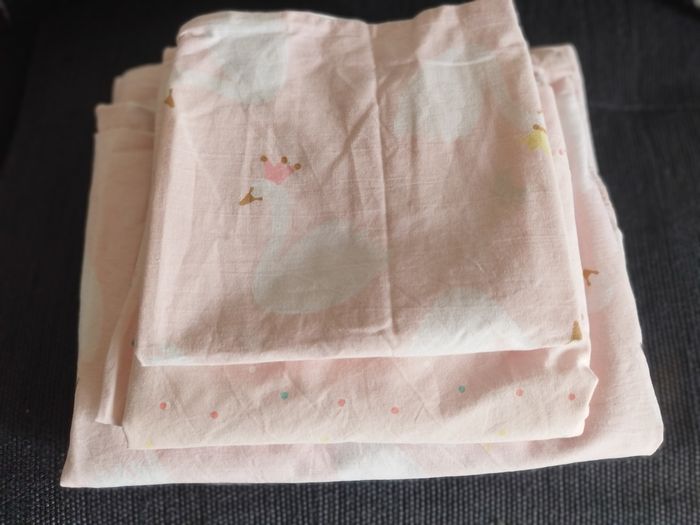 Parure de lit bébé Marque Vertbaudet Couleur rose avec cygnes blancs qui ont des couronnes colorées sur la tête Dimensions : Drap housse 120cm/70cm Housse de couette 120cm/100cm Taie d'oreiller 60cm/40cm Très bon état