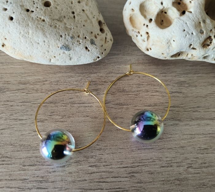 Boucles d'oreilles créoles Anneau doré diamètre 3 cm Grosse Perle avec reflets Neuves Jamais Portées