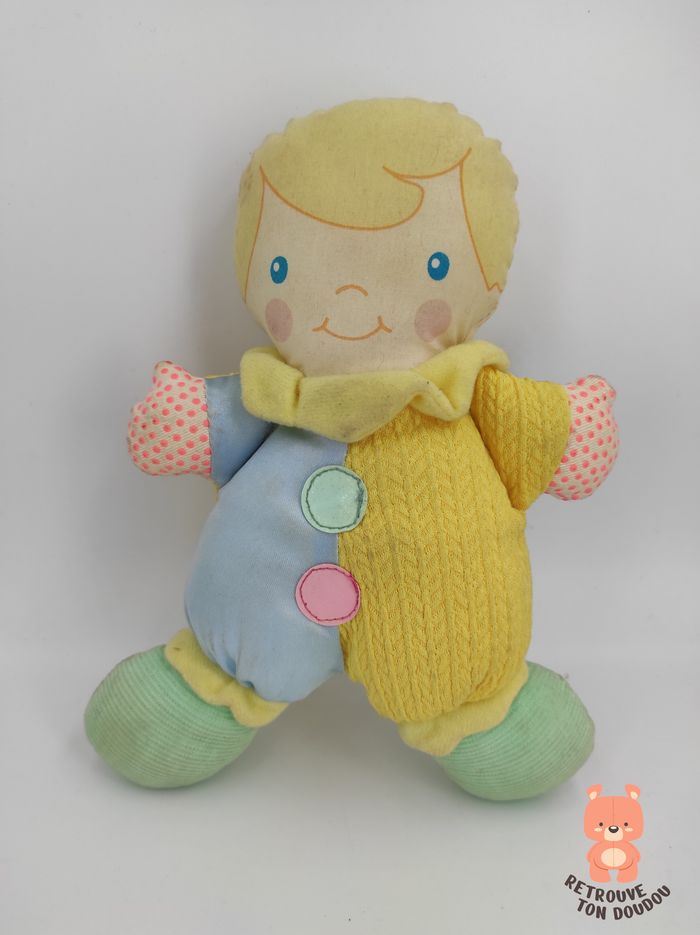 Doudou Poupée de Chiffon petit garçon déguisé en clown de couleur bleu, jaune, vert et rose, marque Berchet, Vintage années 90. 📏 Dimension : 20 cm environ ✨ Occasion, très bon état 🧼 Lavé avec lessive hypoallergénique 👀 Vous achetez le doudou que vous voyez sur les photos.