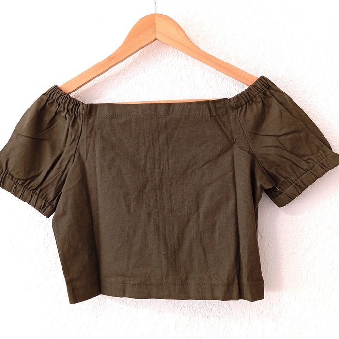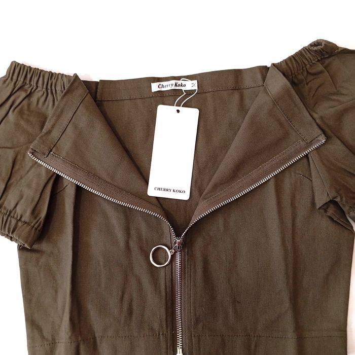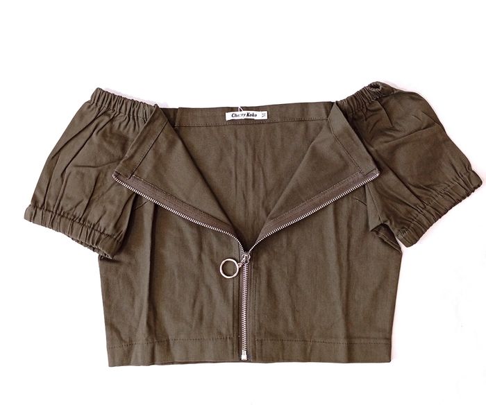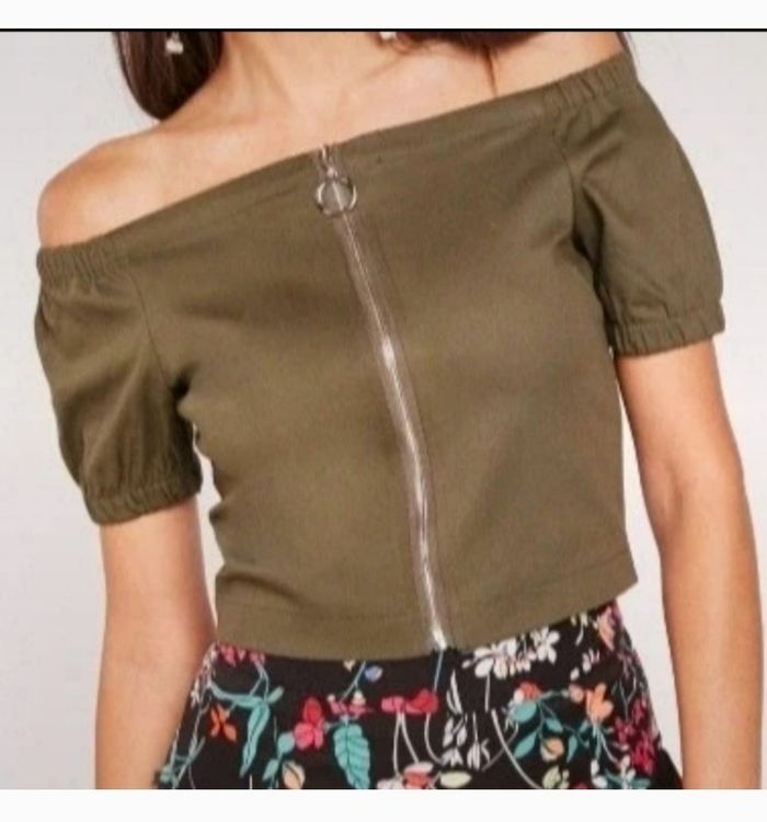 Top crop a epaules dénudées et fermeture éclair. Taille M. Couleur Kaki Vert Militaire - photo numéro 1