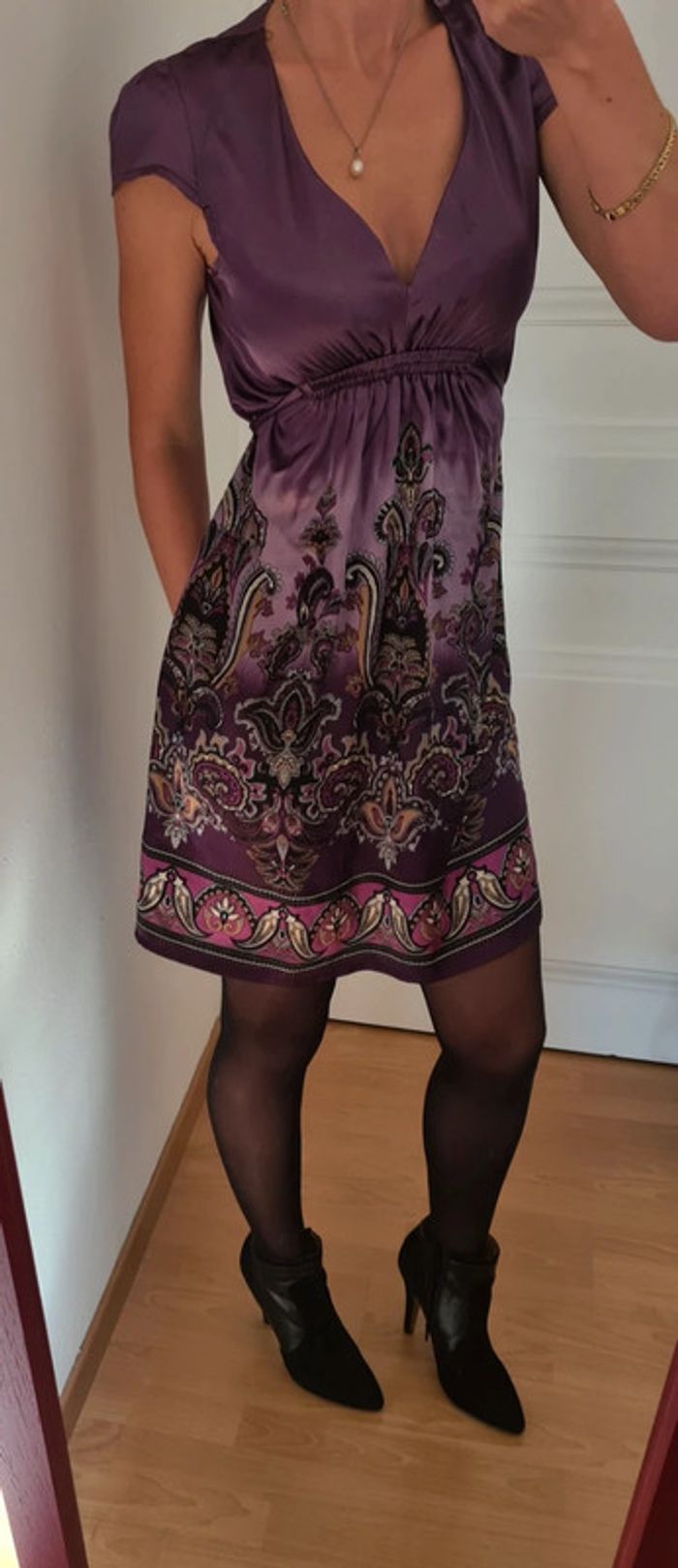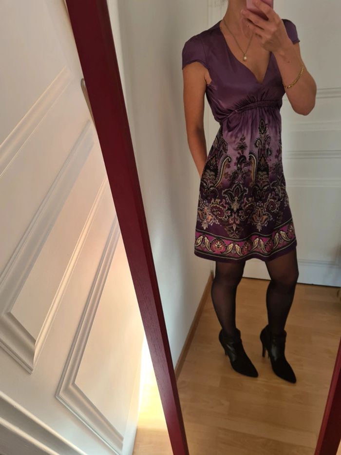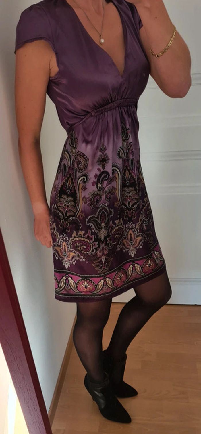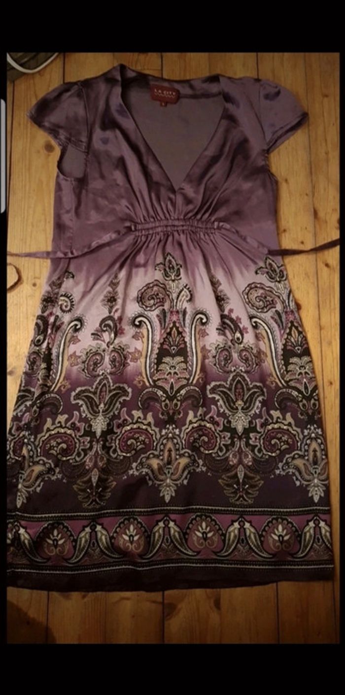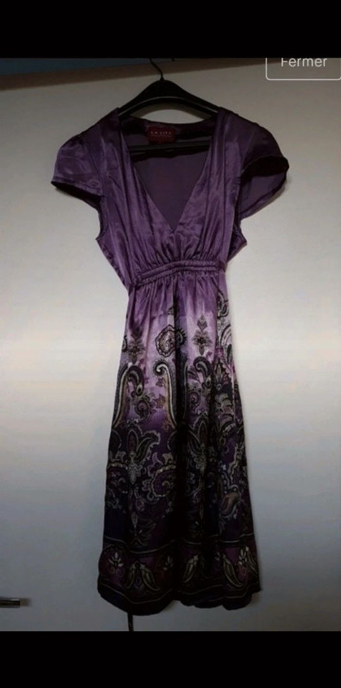Mauve Satin Lien a nouer dans le dos Taille 36 Je mesure 1m65 Petit défaut : fils voir photo ( ne se voit pas , mais je prefere le préciser )
