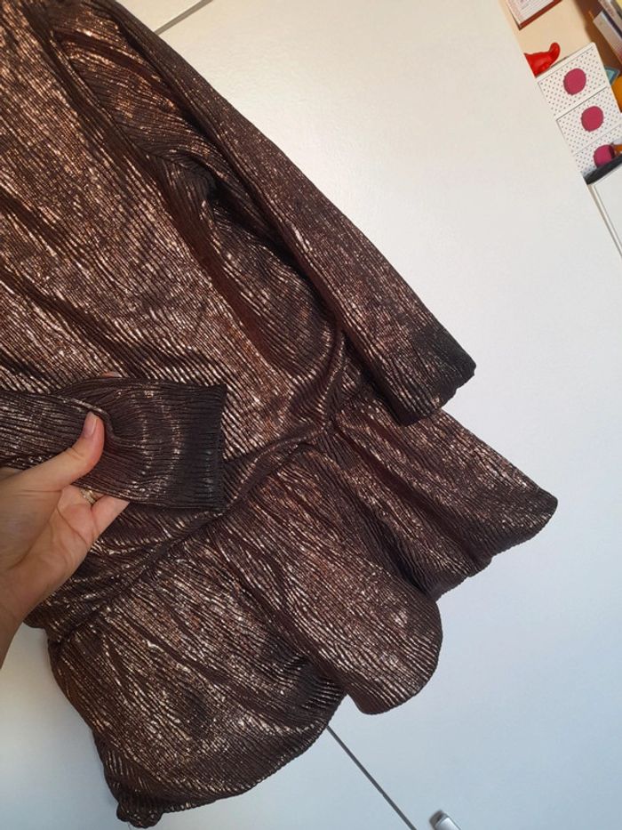 Un côté brillant doré/marron avec des reflet noir au niveau des mains et un côté gris avec des étoiles constellations.