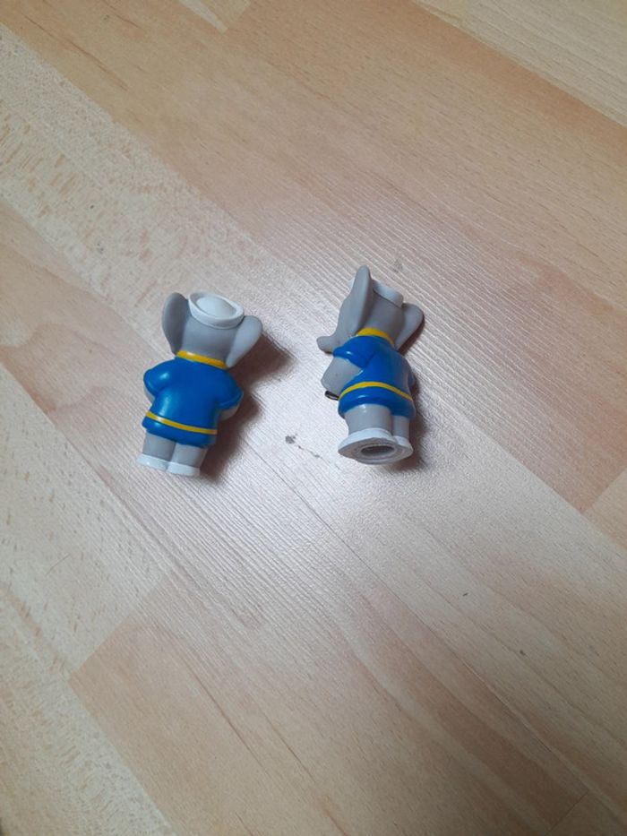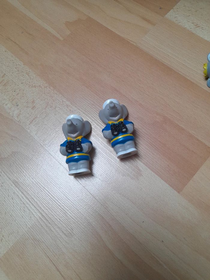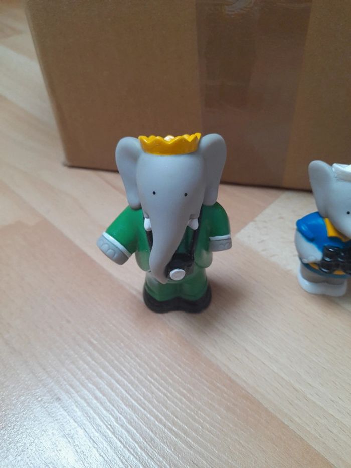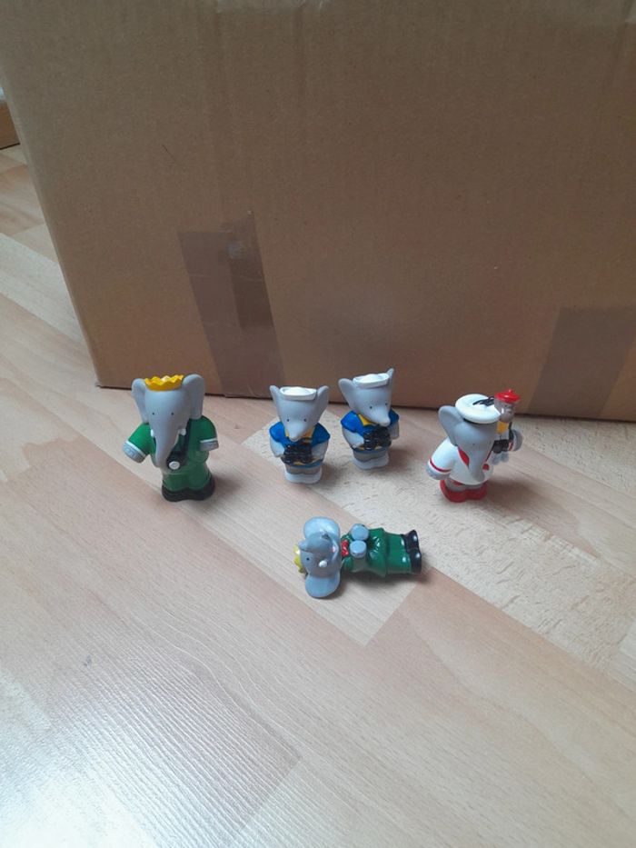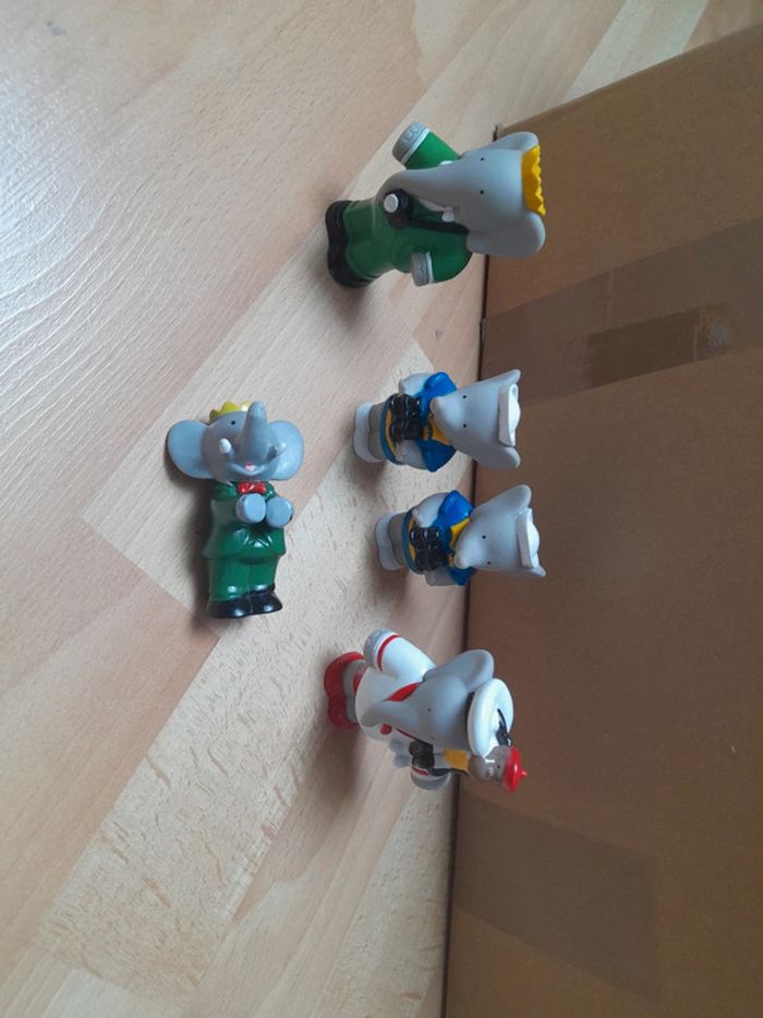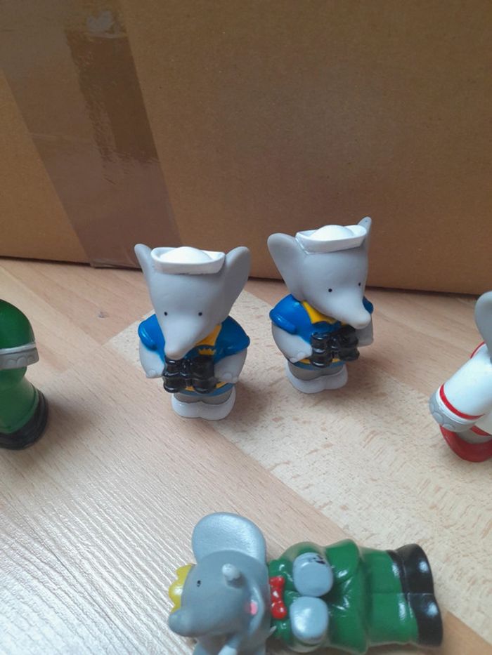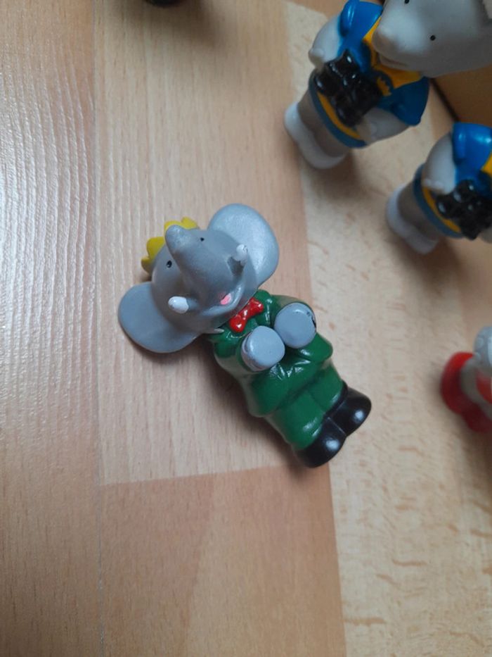 Bonjour Je vends un lot de figurines en plastique Babar de 1990 L. de Brunhoff. État satisfaisant voir photos le Babar couché ne tient pas debout. C7
