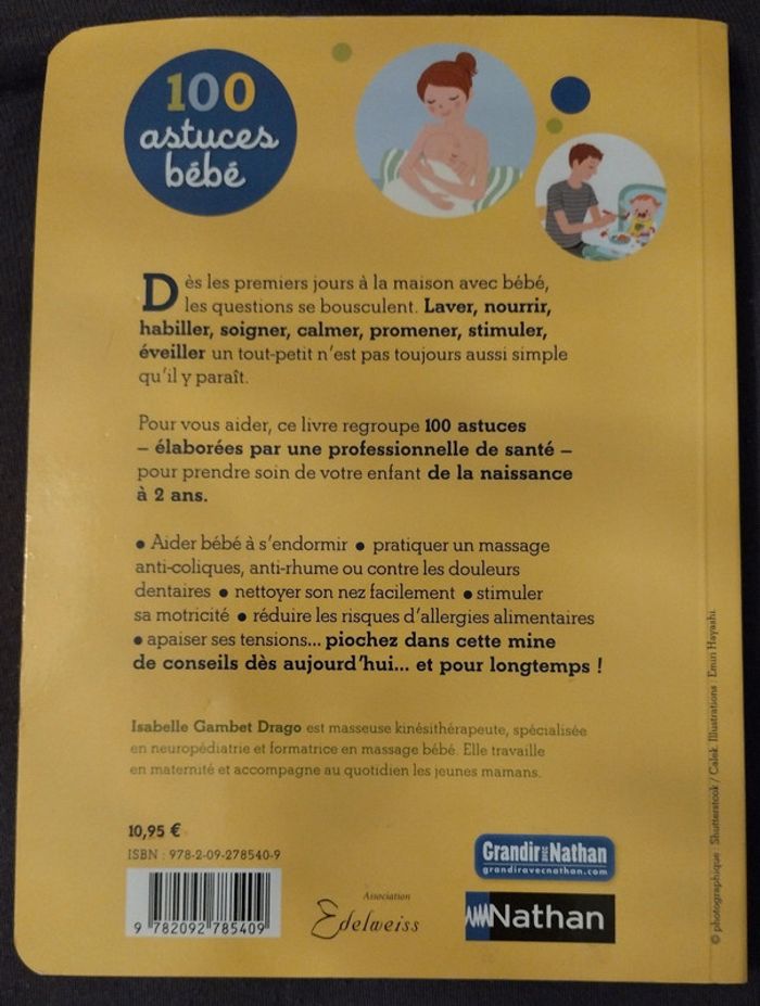 Vends livre "100 astuces bébé". État : bon état. Voir photos, quelques exemples d'astuces. C3 Cordialement,