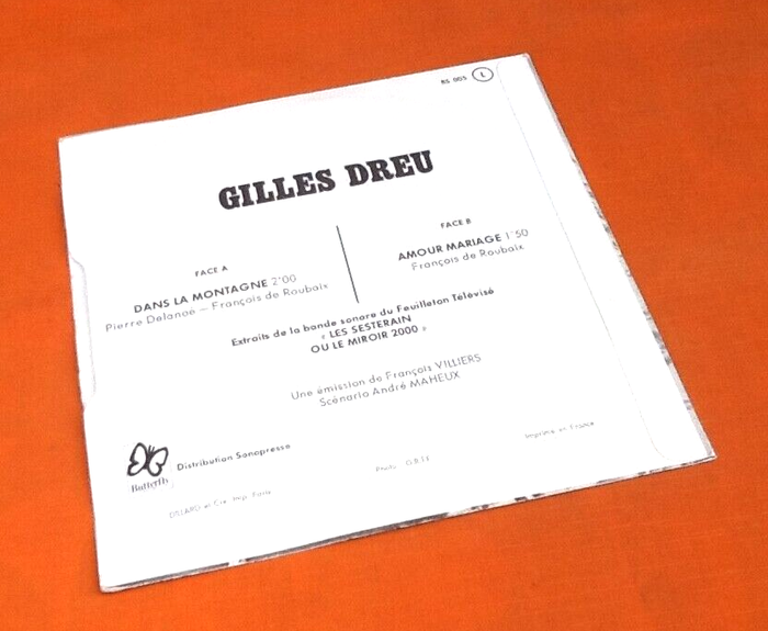 (article vendu en l' état, état d' usage, micro rayures qui n' empêchent pas l' écoute du vinyle) Vinyle 45 tours Gilles Dreu / François De Roubaix " Les Sesterain" ou Le Miroir 2000 Bande Originale Du Feuilleton Télévisé (1971) Butterfly Records BS005 A Dans La Montagne Lyrics By – Pierre Delanoé* Vocals – Gilles Dreu 2:00 B Amour Mariage 1:50