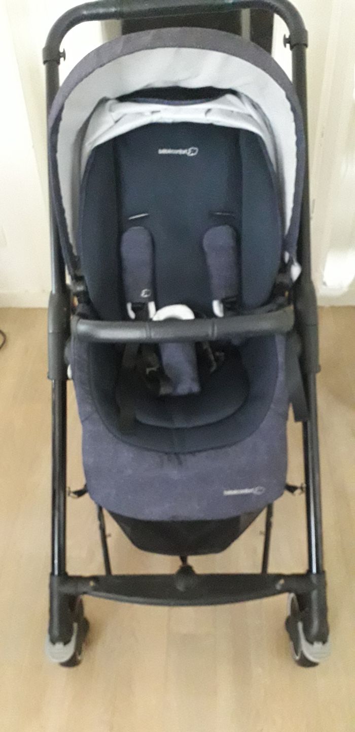 Ensemble duo poussette Mya avec sa nacelle Amber ultra légère Le hamac est neuf , la nacelle a très peu servie , le matelas est neuf . Canopy XXL Se plie et déplie d une main Face maman et face route Grand panier Le châssis est abîmé malheureusement en restant dans le coffre de la voiture avec les courses mais cela ne gêne pas l utilisation. Remise en main propre uniquement sinon l envoi ne peut se faire qu en 2 parties et coûte cher