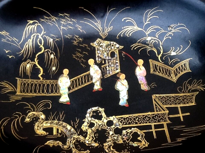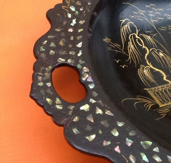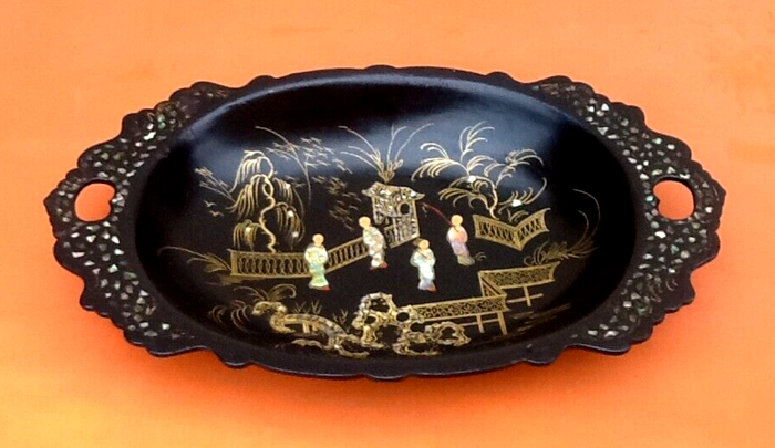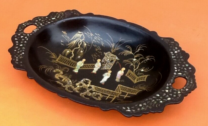 Corbeille Napoléon III Carton bouilli Laqué à décor japonisant Incrustation de nacre / Peinture à l' or Longueur : 390mm Largeur : 250mm Hauteur : 55mm Poids : 410grs
