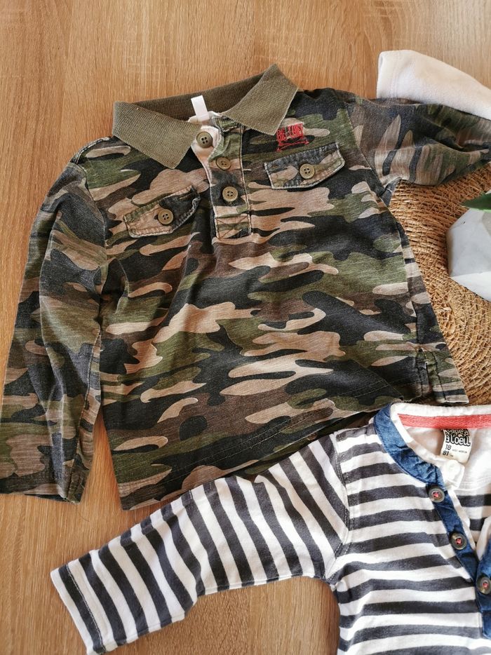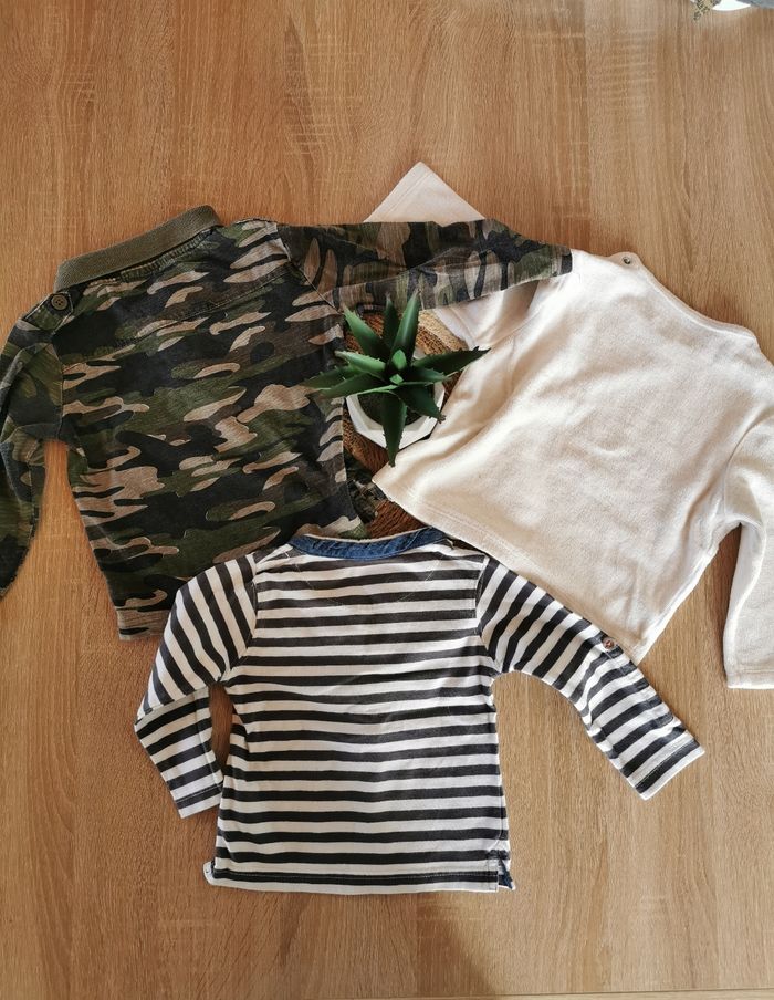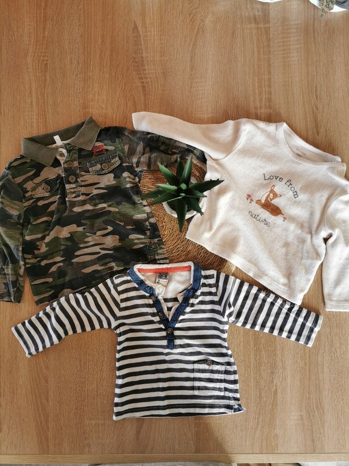 Lot de 2 tee shirts manches longues et 1 pull en bon état général, porter mais peu encore largement servir (seul les couleurs sont un peu moindre que neuf). Plusieurs marques, Tape à l'œil, kiabi et kidnakai, le tout en 18 mois.