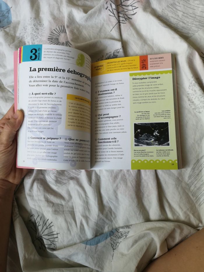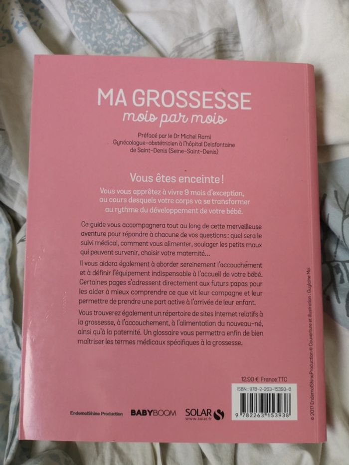 Toutes les choses à savoir tout eu long de la grossesse, d'une manière simple, claire et colorée. Pas de longs textes Infos pratiques et petits tuyaux Très bon état Couverture légèrement pliée par les mains de bébé en prenant la photo 😅 Comme neuf a l'intérieur