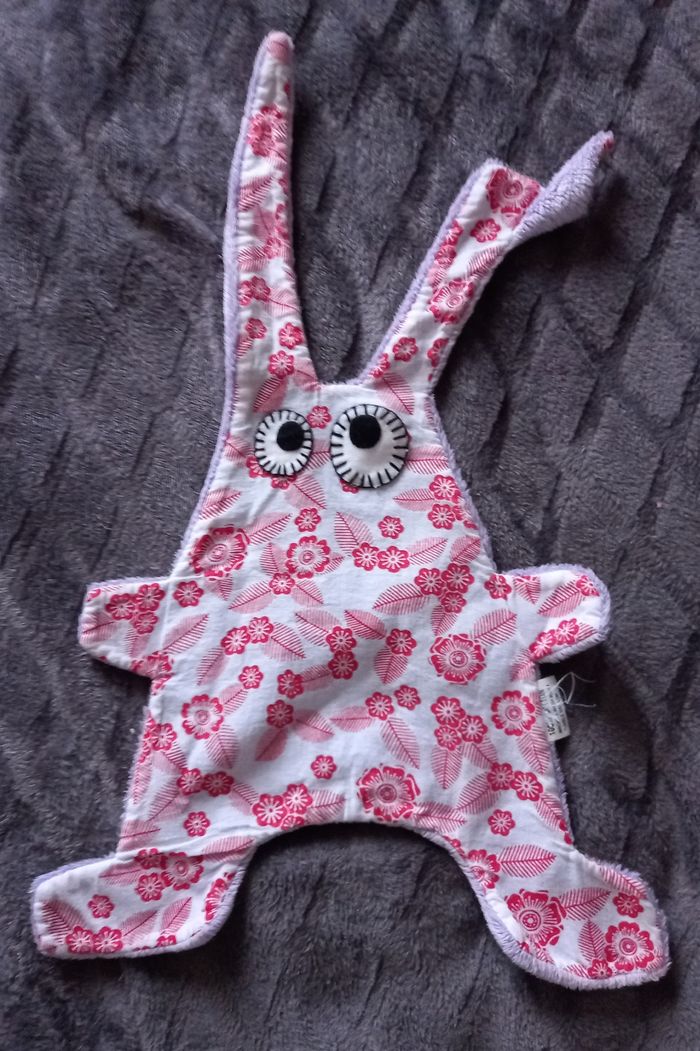 Doudou plat Lapin en tissu de couleur blanc avec motifs imprimées de couleurs rouge , et feuilles et de l autre côté en velours de couleur mauve