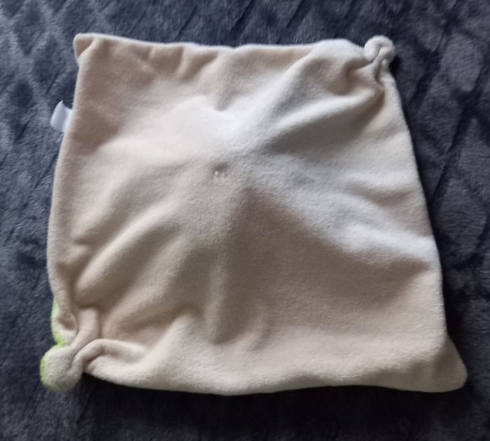 Doudou carré plat en velours de couleurs saumon, vert ,mauve et bleu et de l autre côté en velours de couleur beige Chien sur le milieu du doudou Nœuds et bruits de papiers froissés dans chaque coin du doudou