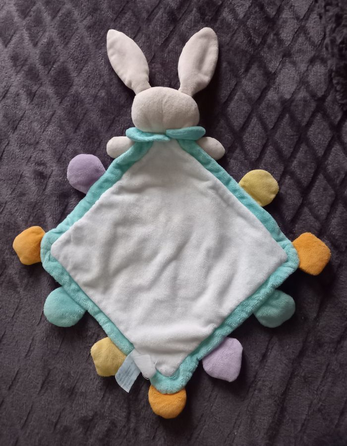 Doudou lplat losange en velours de couleur blanc et le contour en velours de couleur bleu Étiquettes en velours multicolores avec bruit de papiers froissés et écritures Crak crak cousu sur le contour du doudou Lapin sur le haut du doudou et le corps brodé sur le doudou