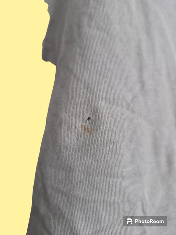 Haut crop top Bershka blanc Zara taille s en assez bon état car il y a un petit trou et une petite tache. (Voir 3eme photo). Si le haut est pris, le deuxième article de mon dressing sera a -50% soit deux articles pour 1€50.