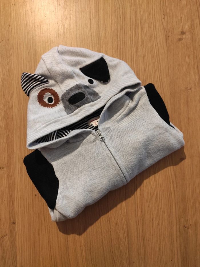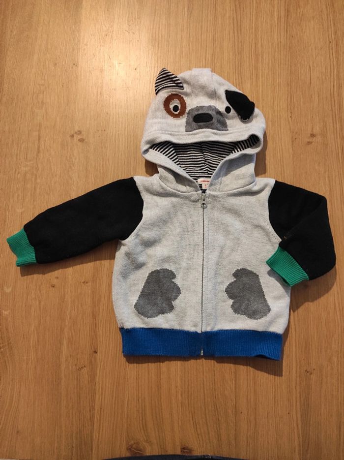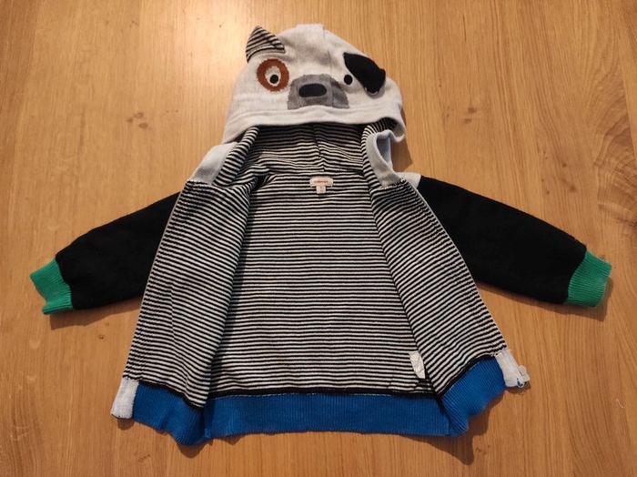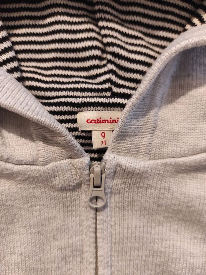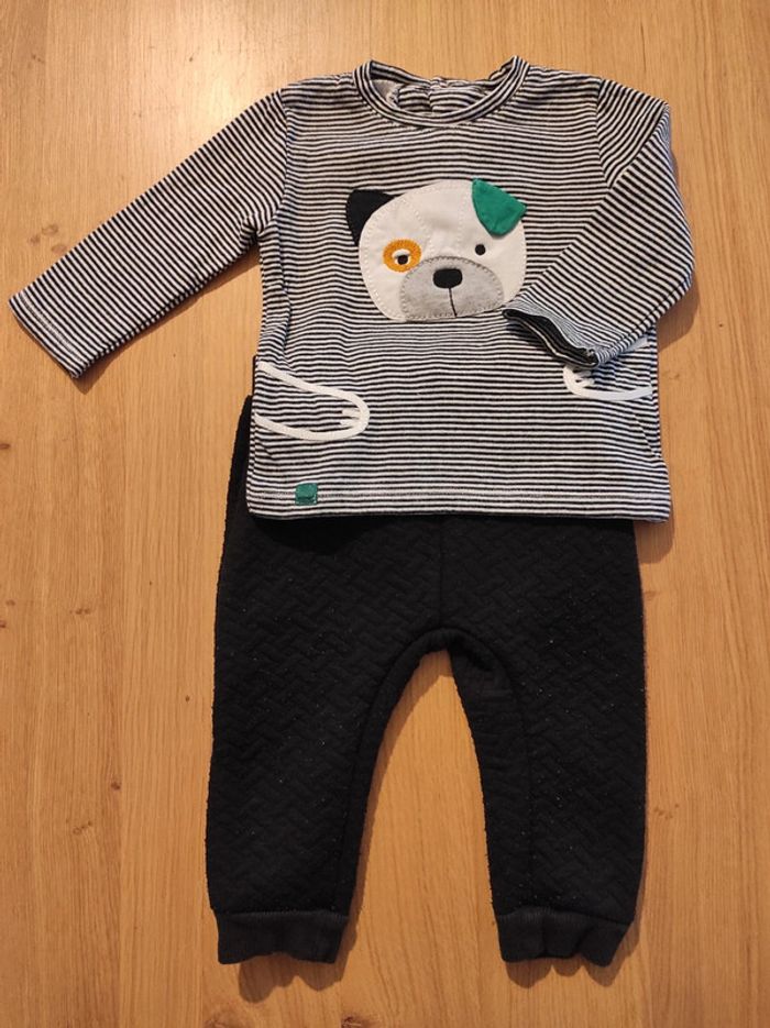 Ensemble mixte Catimini assorti en taille 9 mois (71 cm) comprenant : -Un tee-shirt en très bon état, rayé noir et blanc, motif chien -Un gilet zippé en très bon état, gris clair, manches noires, intérieur rayé noir et blanc -Un pantalon souple en coton noir, en bon état car bien bouloché sur les jambes mais reste tout a fait mettable et confortable à l'intérieur. Possibilité de vente à l'unité sur demande.
