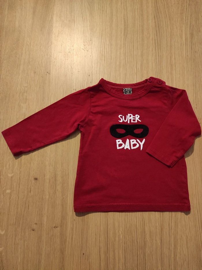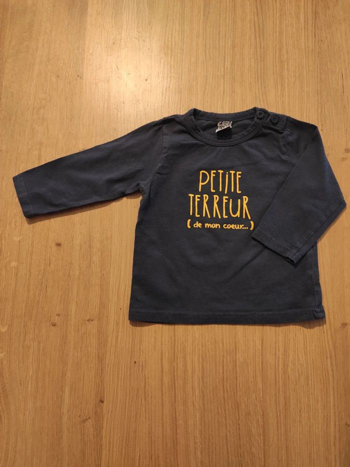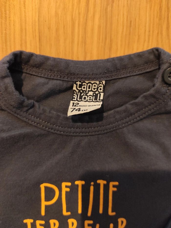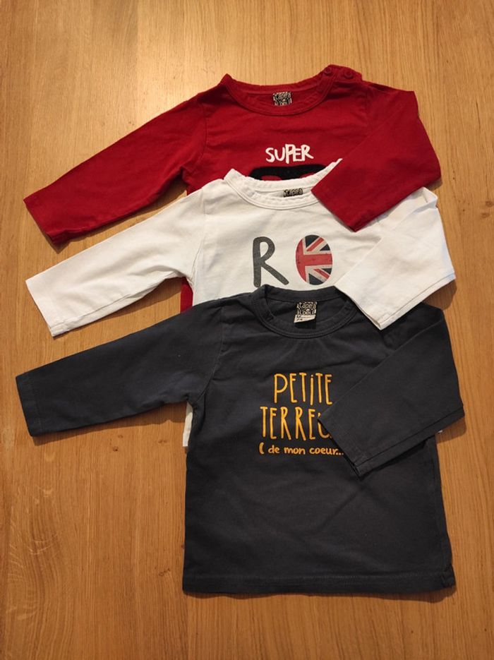 Lot de 3 tee-shirts manches longues Tape à l'oeil taille 12 mois comprenant : Un tee-shirt rouge inscription "super baby" Un tee-shirt blanc inscription "Rock like dad" Un tee-shirt gris foncé inscription "petite terreur de mon coeur" Tous en parfait état. Vente possible à l'unité sur demande.
