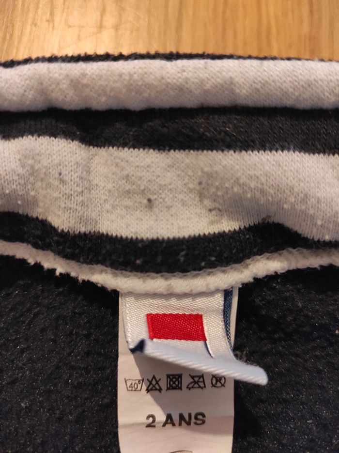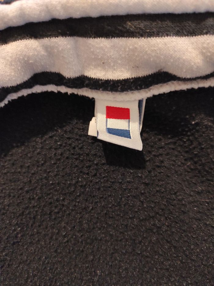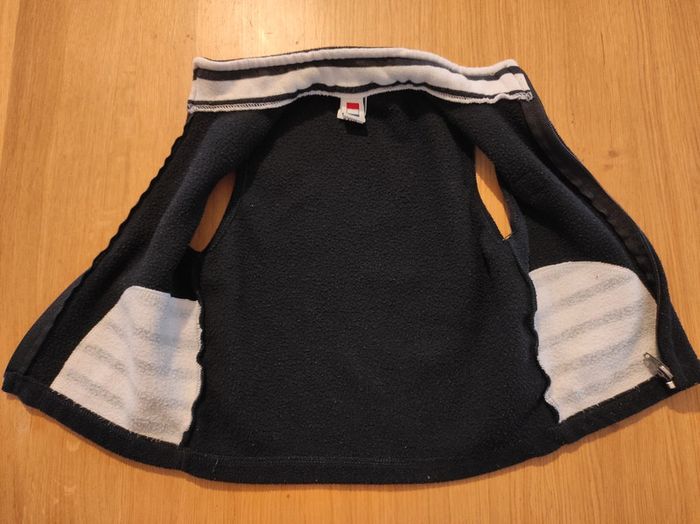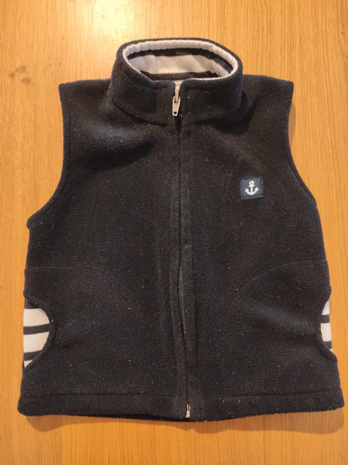 Petite polaire sans manches, taille 2 ans, col et poches motif marinière. Sans marque, mais fabriqué en France. En bon état car la polaire est un peu boulochée à l'intérieur.