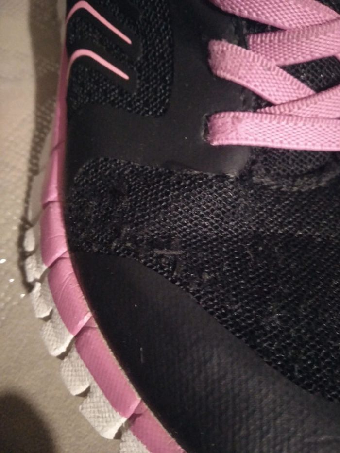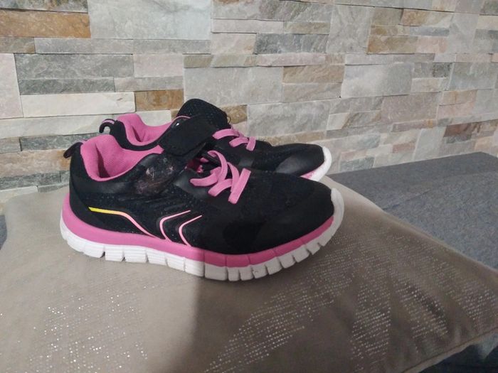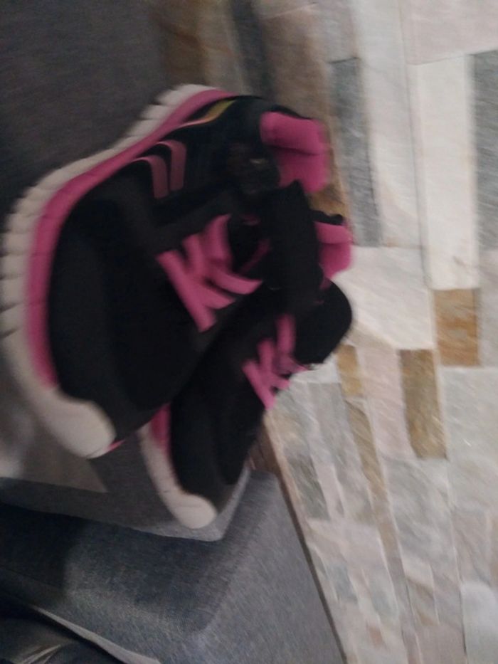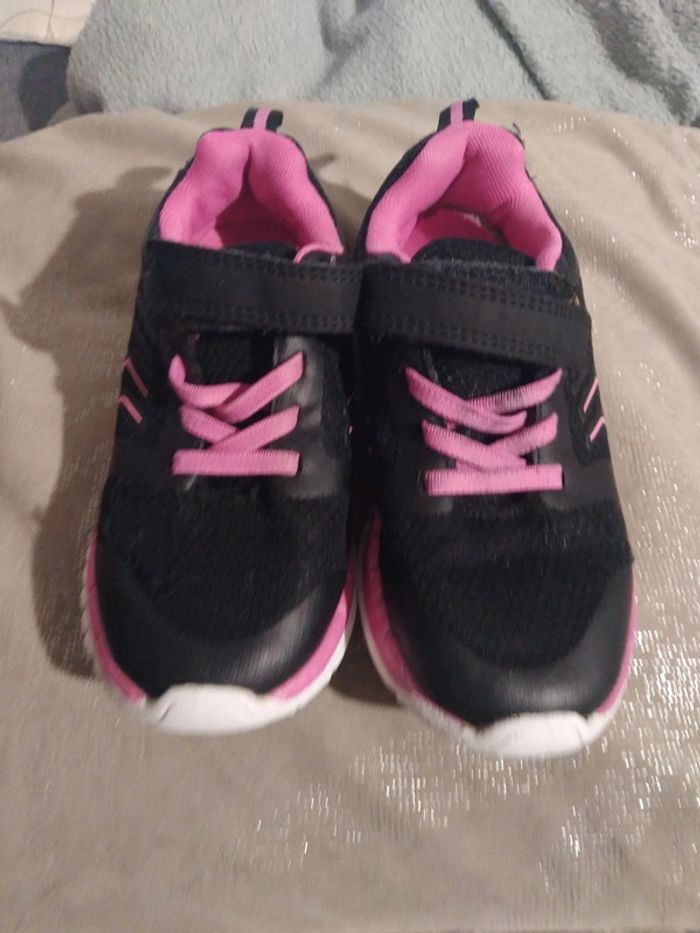 Jolies baskets scratch taille 30 on peut noter sur le lacet rose un trace noire(peinture ou encre à l'école) et un peu de bouloches.elles peuvent avoir une belle seconde vie au jardin ,au parc etc....