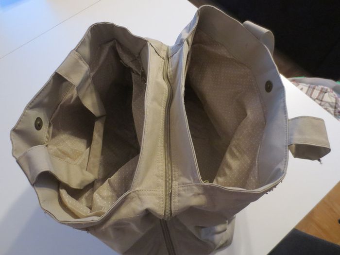 Sac beige avec de multiple poche 3 grandes poches (une immense qui ferme avec une fermeture + 2 assez grande qui se ferme avec une pression) - dans les deux plus petites poches se trouve 1 poche fermé avec une fermeture plus de photos ou infos sur demande #sacdiaboloflo