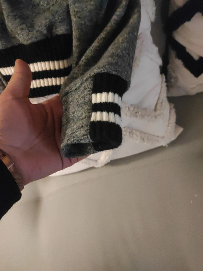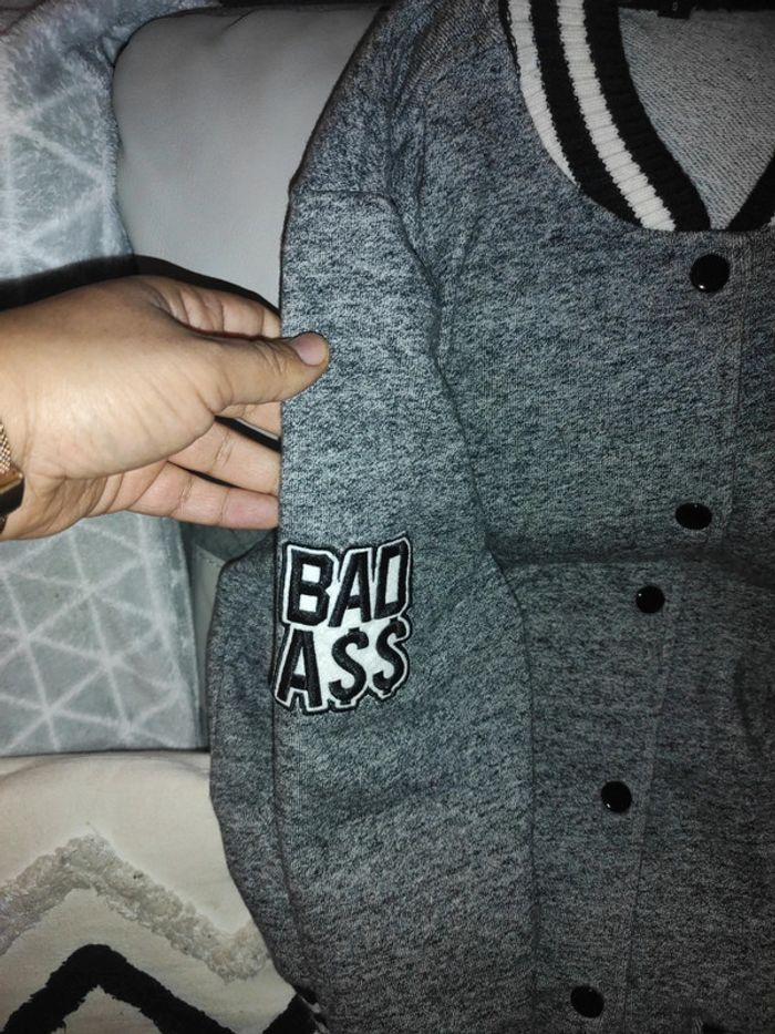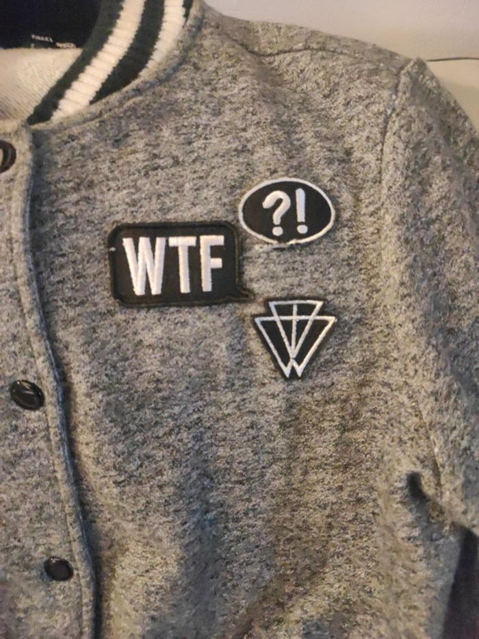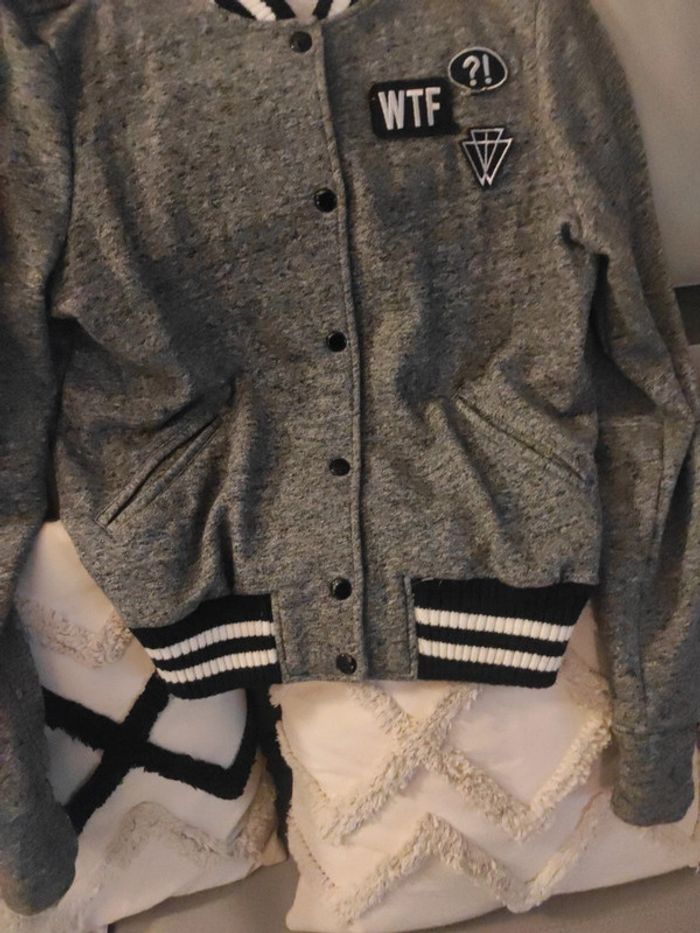 Bombers style américain collège Gris noir blanc Motifs WTF, badass Matière chaude , épaisse, col avec rayures noires blanches Fermeture boutons pression État impeccable Envoi rapide