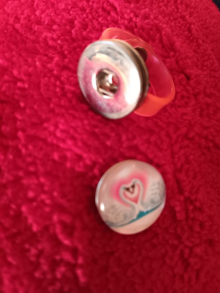 Bague de couleur rose réglable Possibilité de changer cabochon Décor cygnes blancs formant un cœur