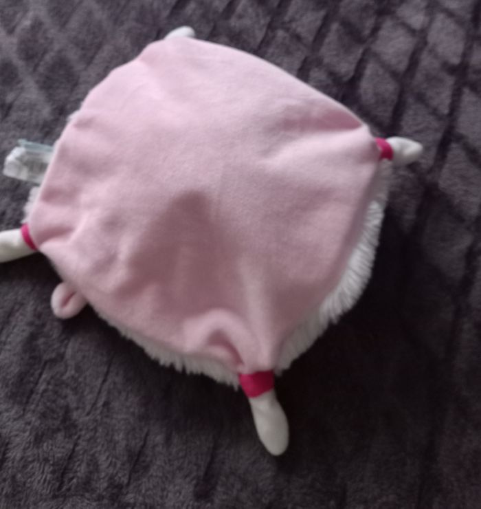 Doudou carré plat en velours fourrures de couleur blanc et de l autre côté en velours de couleur rose Licorne sur le milieu du doudou Corne dorée sur la tête Pétales en velours de couleur rose sur la côte de la licorne Arc en ciel brodé dessus