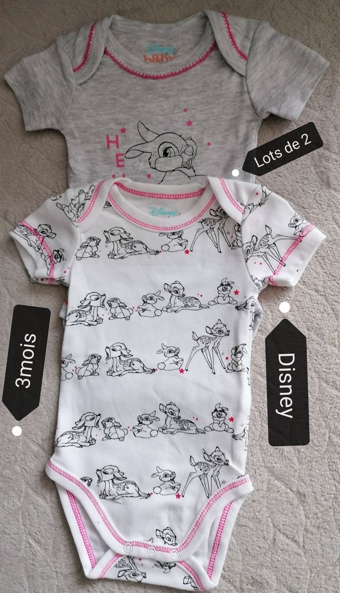 Lots de 2 bodies bébé filles Disney. Age 3mois Manches courtes Couleur : gris / blanc Matière tissus : 98%coton. 2%polyester. Neuf avec étiquette 8€