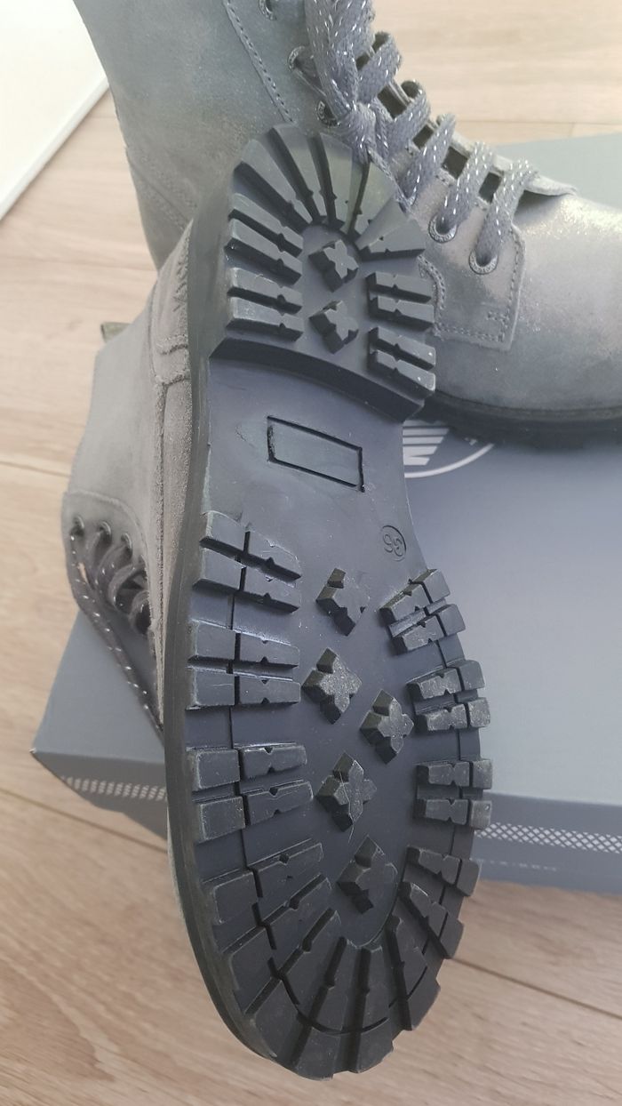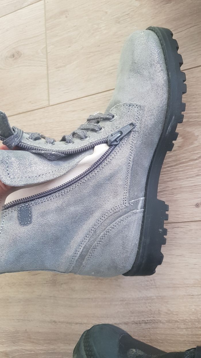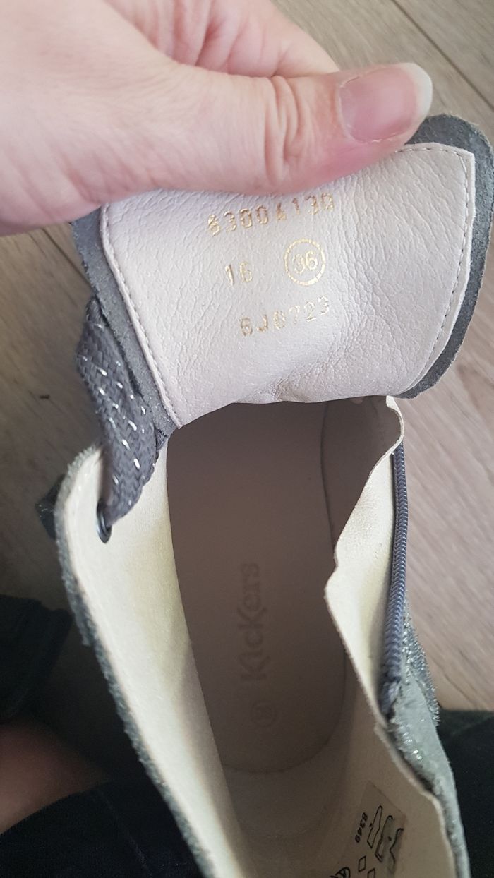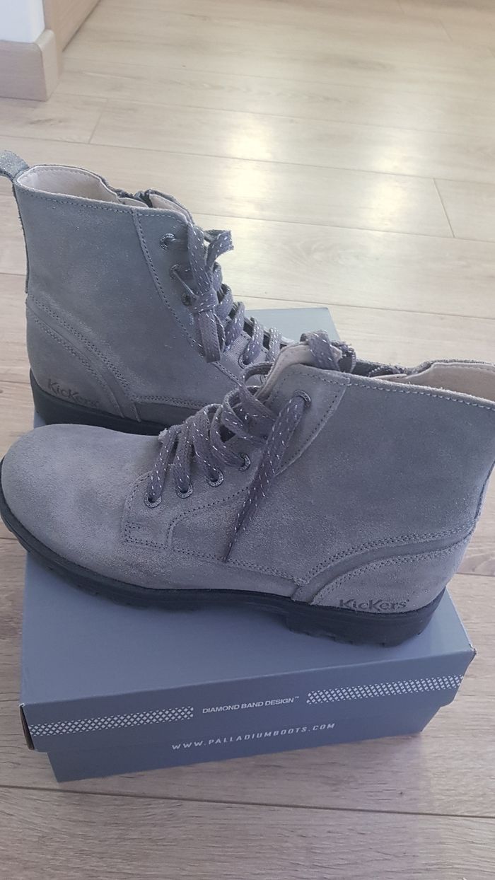 Vends bottine Kickers neuve en cuir grise argentée en taille 36. Ma fille ne les a jamais portée.