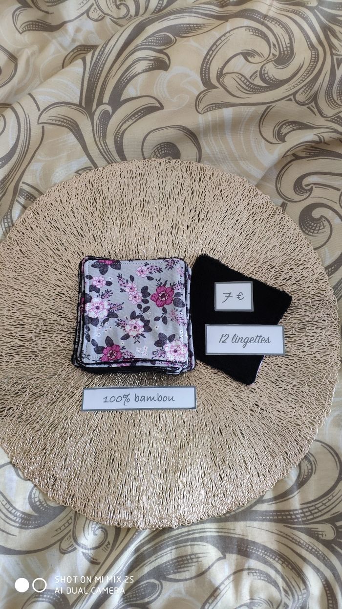 Tissu eko-tex français et éponge bambou noir, 10 X10 cm, pour bébé et démaquillante pour les mamans 😄