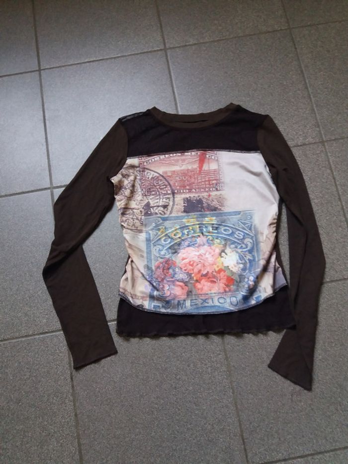Joli haut marron avec imprimer vintage Tres bon etat taille 36 ou petit 38