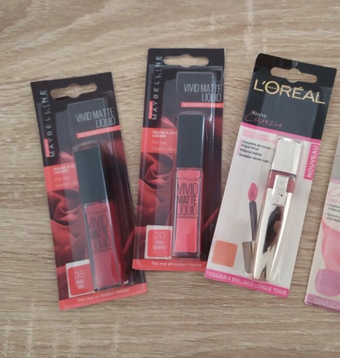 Lot de 2 gloss, reference : Maybeline Vivid Matte Liquid 20 et 35 /// encre à lèvres L’Oréal 501 Bonnie Neufs, encore sous leurs emballages D’autres produits de beauté sont disponibles dans mon dressing :) #noranathema_maquillage maquillage make up mascara contouring blush highlighter fond de teint fard à paupières