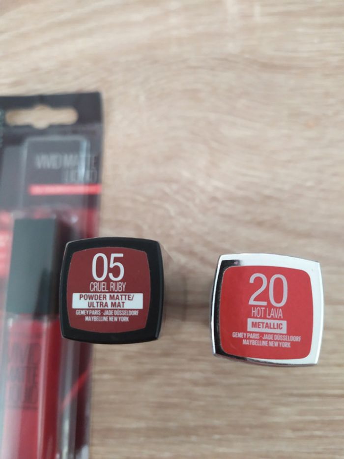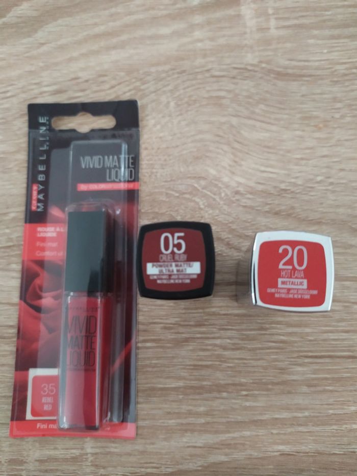 3 rouges à lèvres Maybelline références : Vivid Matte Liquid, 35 Rebel Red / rouge à lèvres bâton 05 Cruel Ruby / 20 Hot Lava Metallic #noranathema_maquillage