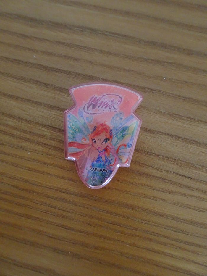 Accessoire winx club bloom en forme de badge, très bon état, plastique. 3,5 cm.