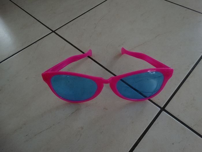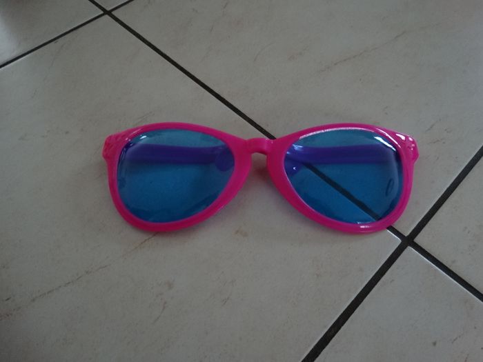 Grosses lunettes pour soirées déguisées, soirées à thème, déguisement, rose fuchsia et verres bleu, en très bon état, 26 cm de longueur.