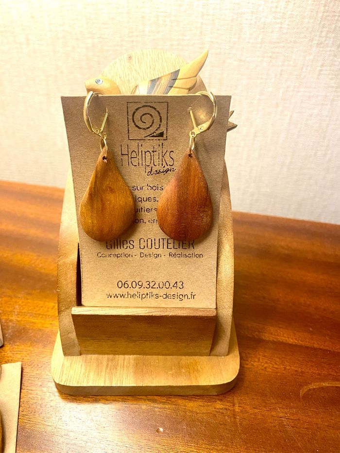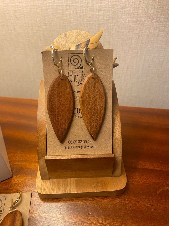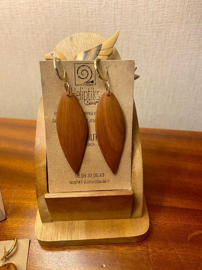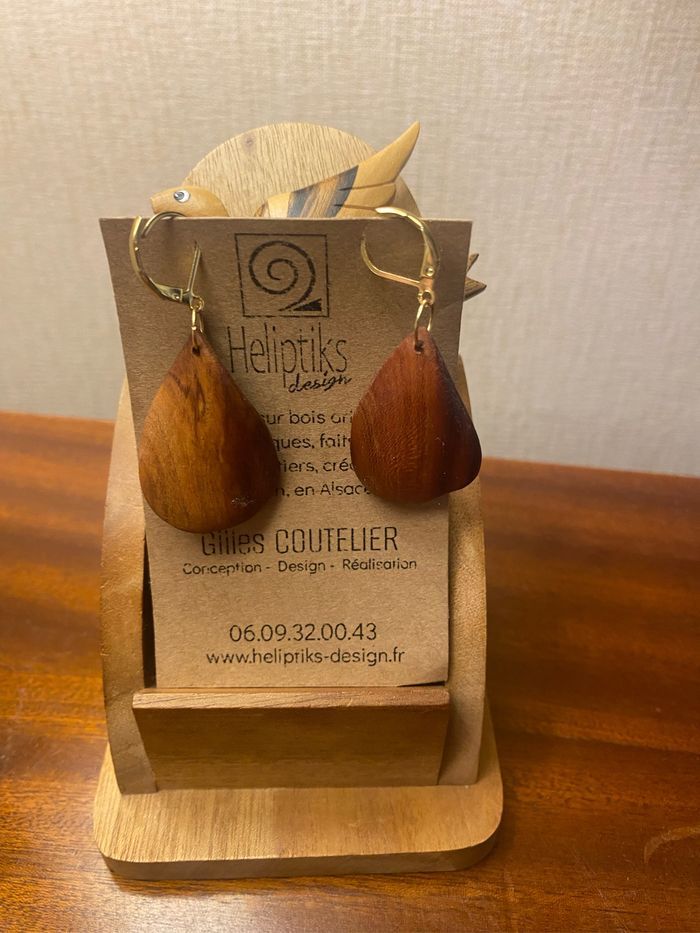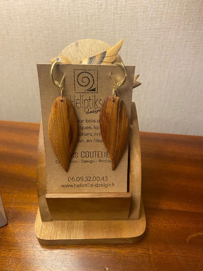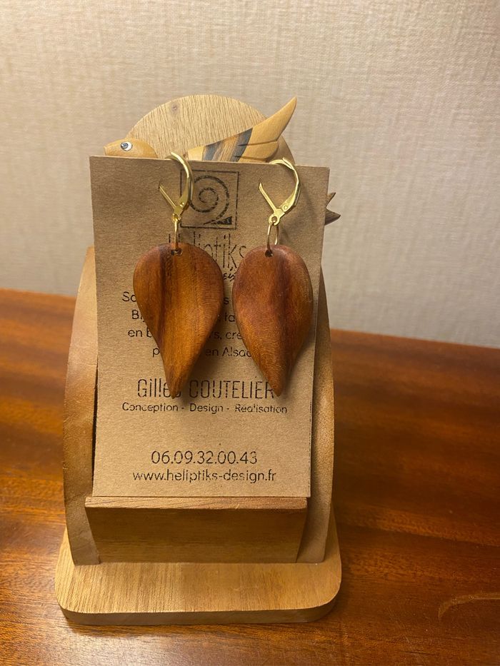 Boucles d’oreilles en bois fait main il n’y a aucun produits chimiques dessus. Les attaches sont en plaqué or . Les boucles d’oreilles sont fabriqués en Alsace avec du bois