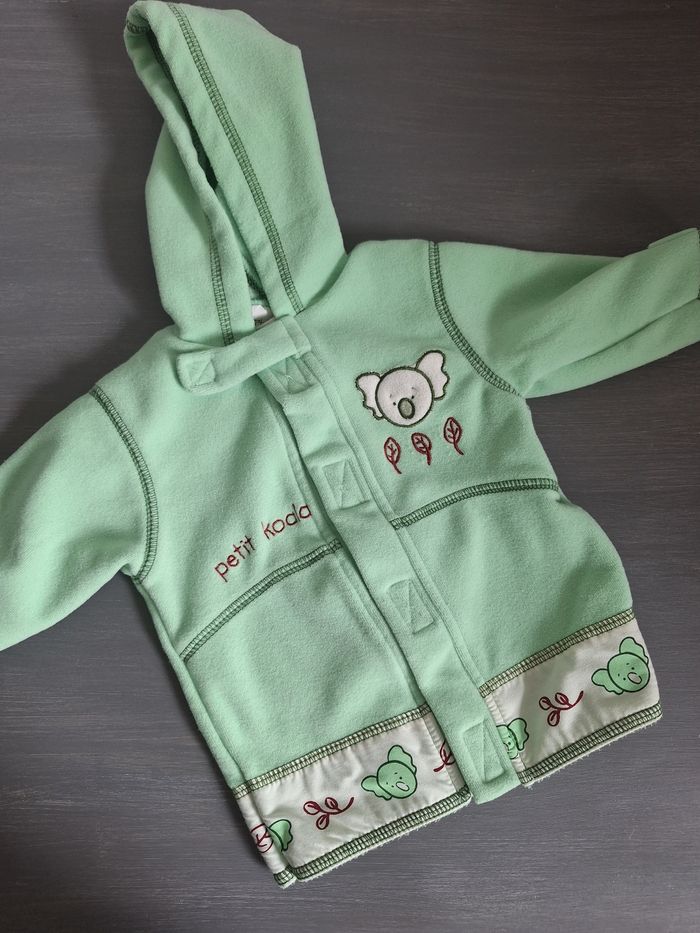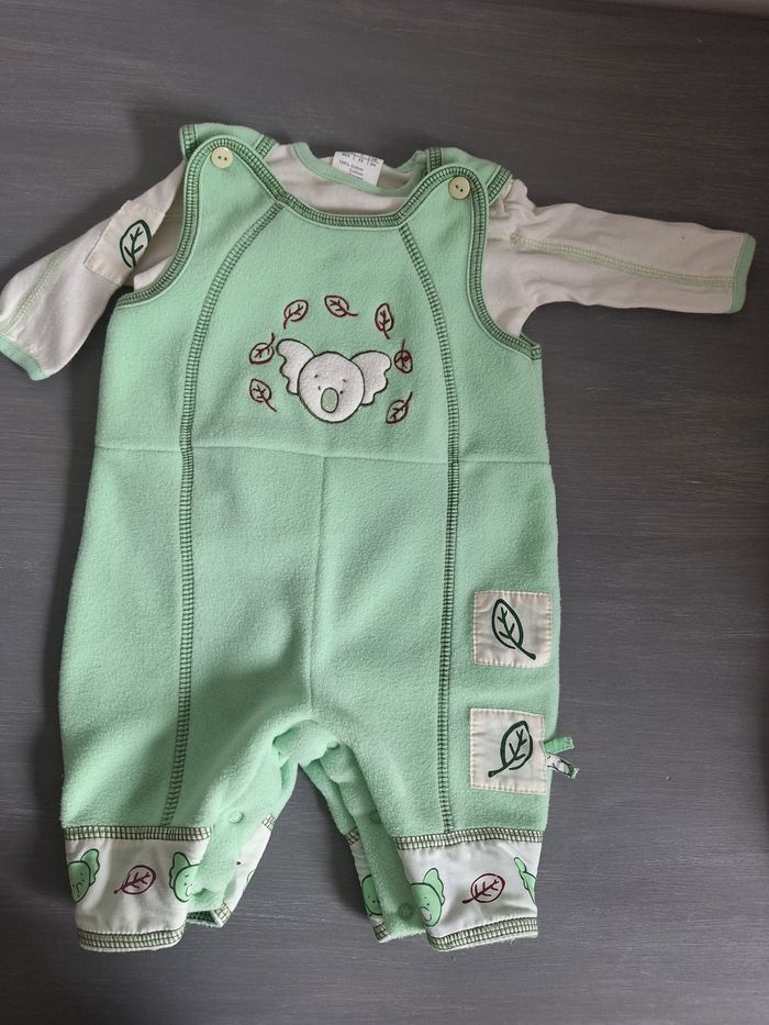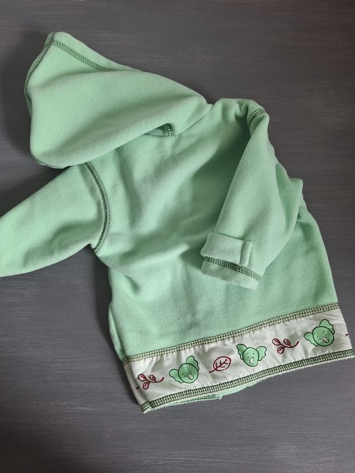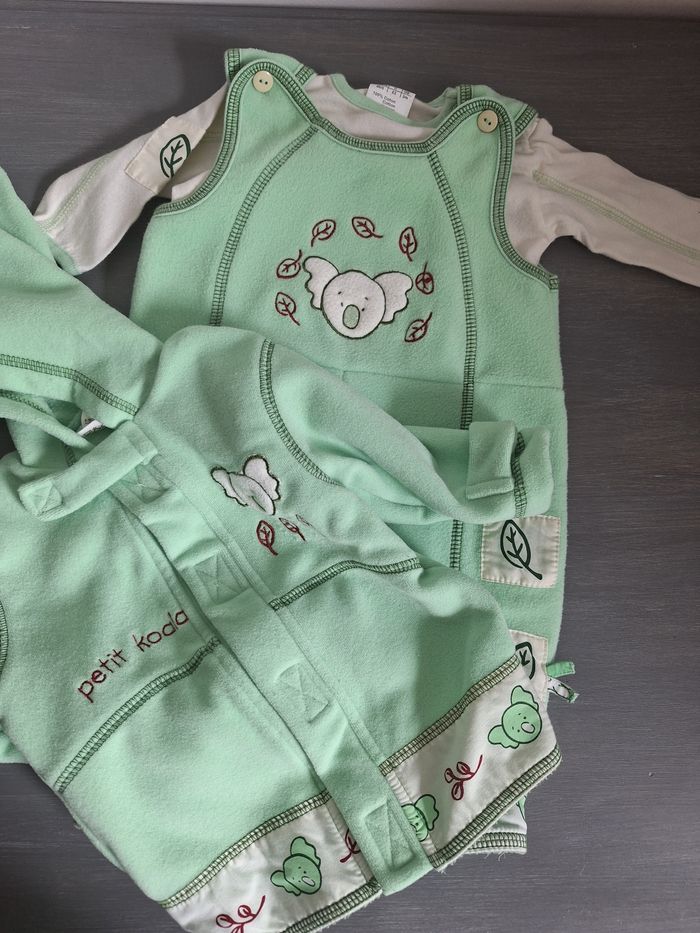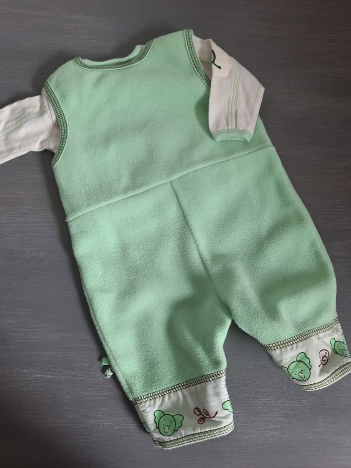 GARÇON 6 MOIS N°716 ensemble 3 pièces : - maillot , 100% coton Longue manche ecru Pression épaule -salopette polaire Vert pomme Pression entre jambes 100% polyester - veste Scratch Capuche , 100% polyester Taille 6 mois #kelly_garçon6mois