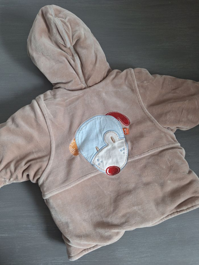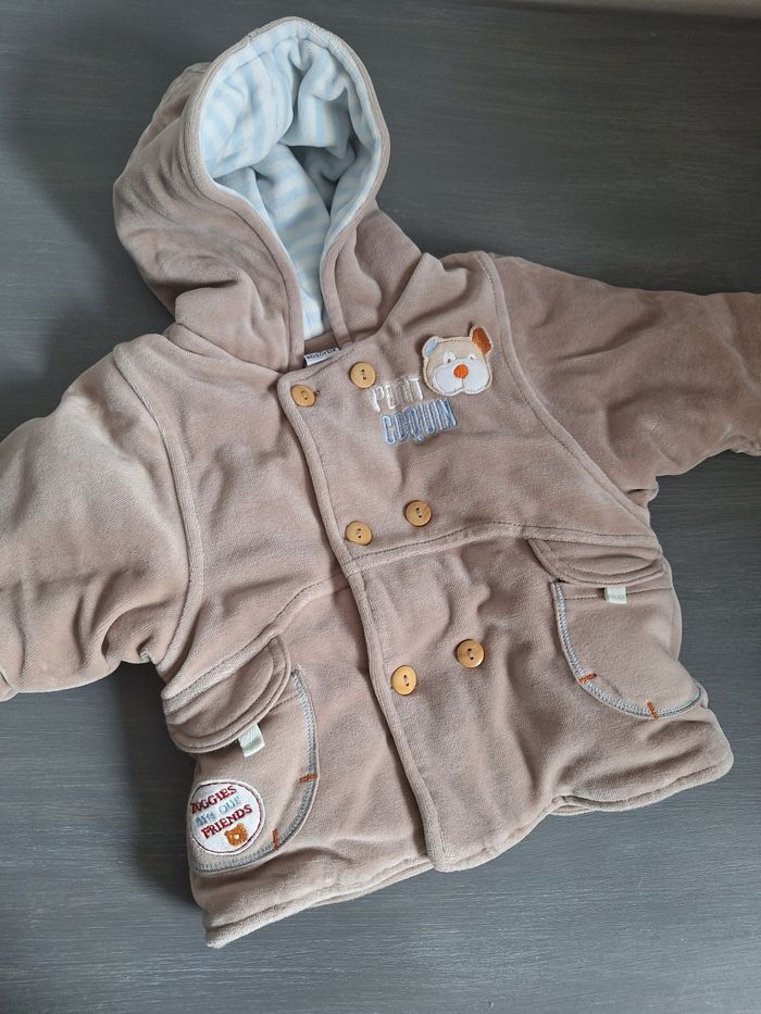GARÇON 3 MOIS N°910 manteau epais Velours taupe Bouton , capuche 77% coton 23% polyester Doublurec100% coton Taille 3 mois Absorba 5€ #kelly_garçon3mois