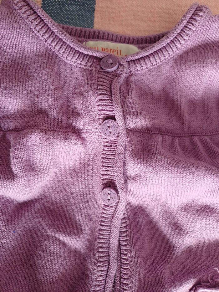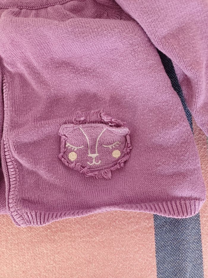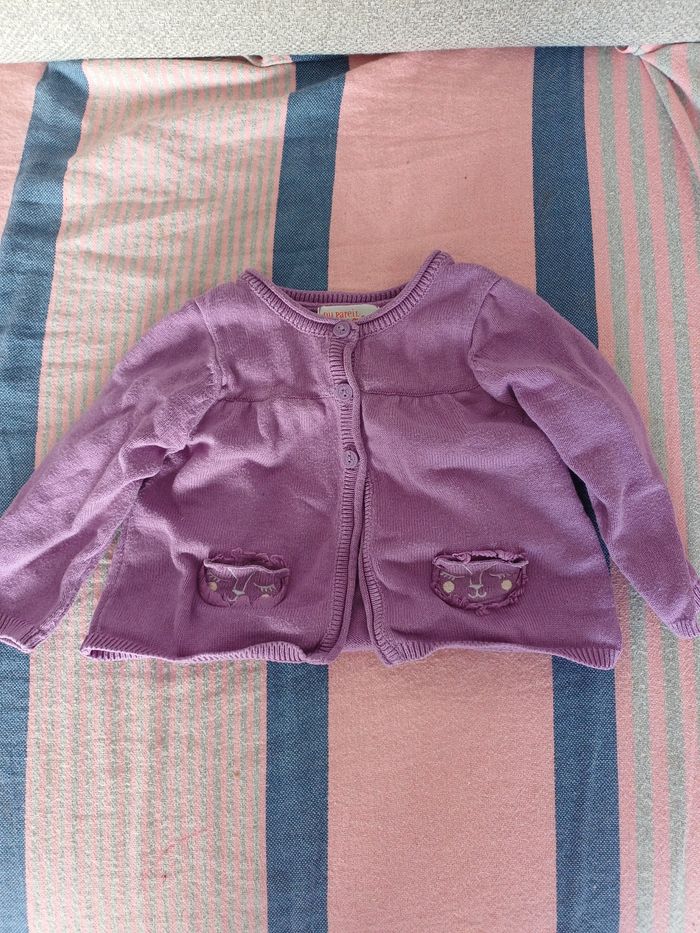 Gilet violet avec petite pochette chat. Sympa pour les soirées un peu fraîche du printemps.