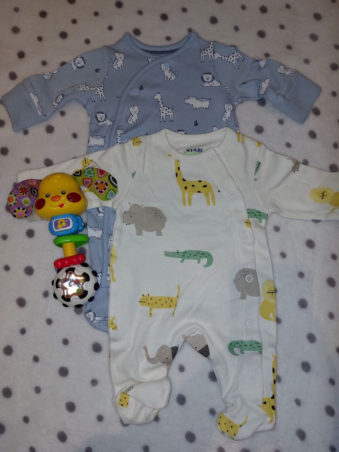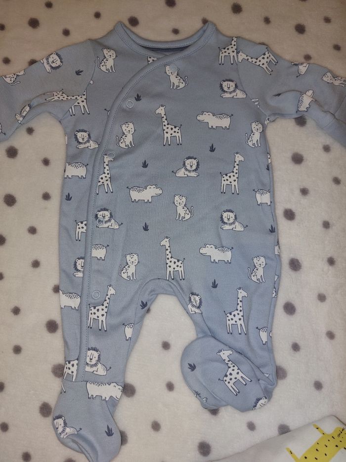 Mot pyjama 50 1 blanc avec animaux kiabi (juste un.pztit défaut voir photo) 1 bleu avec animaux